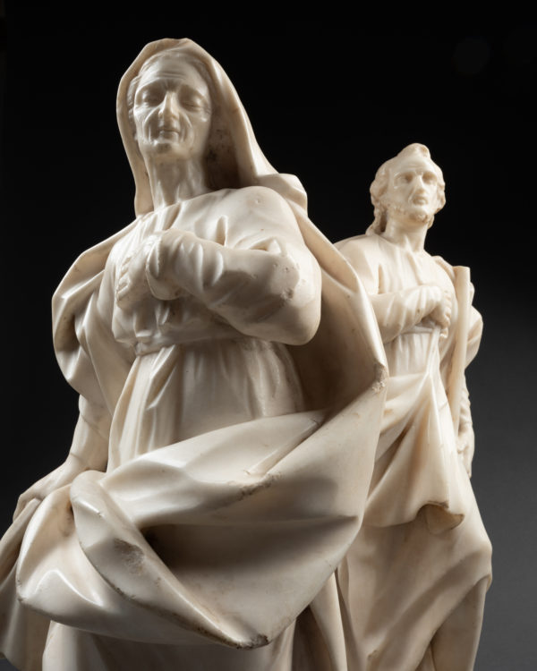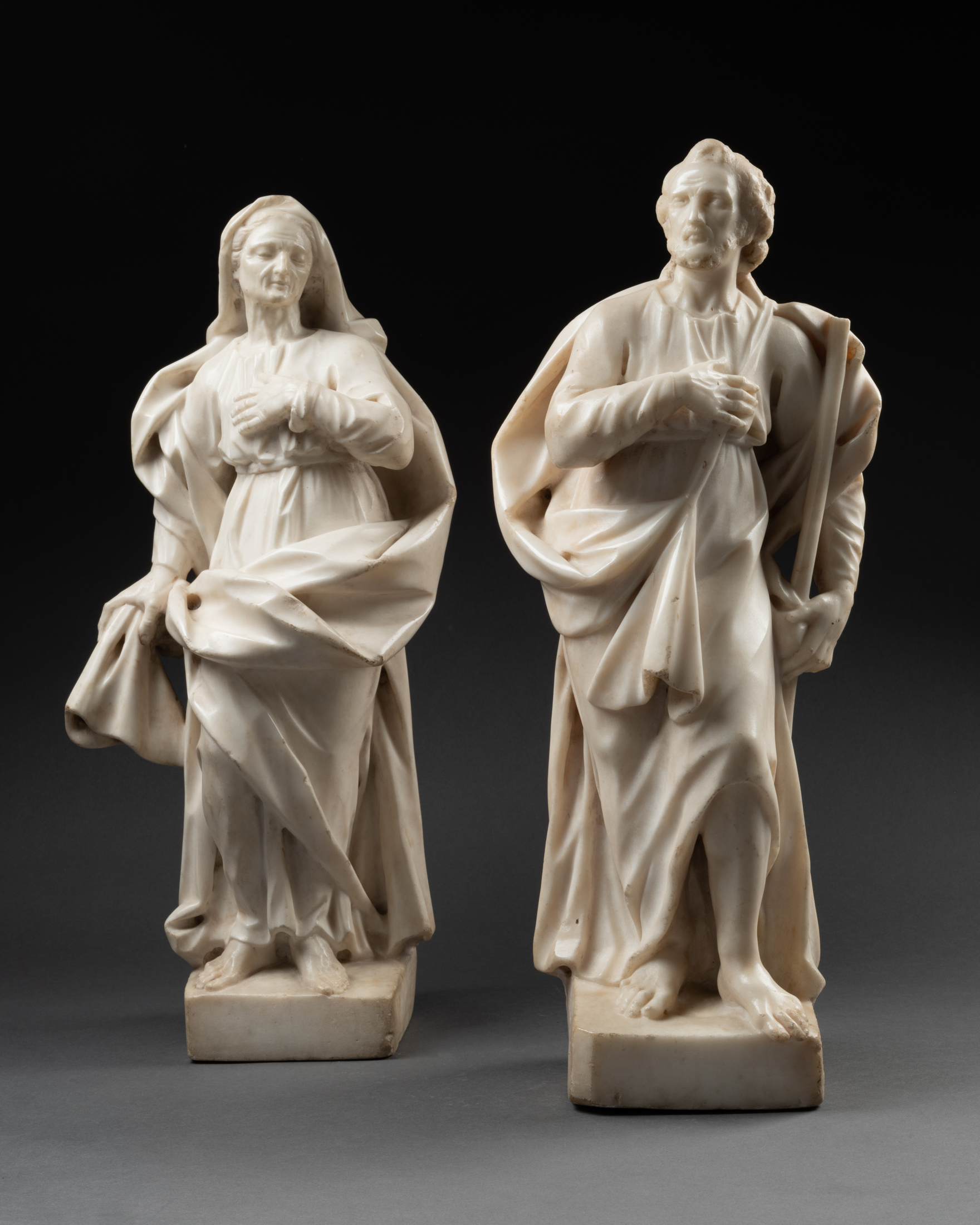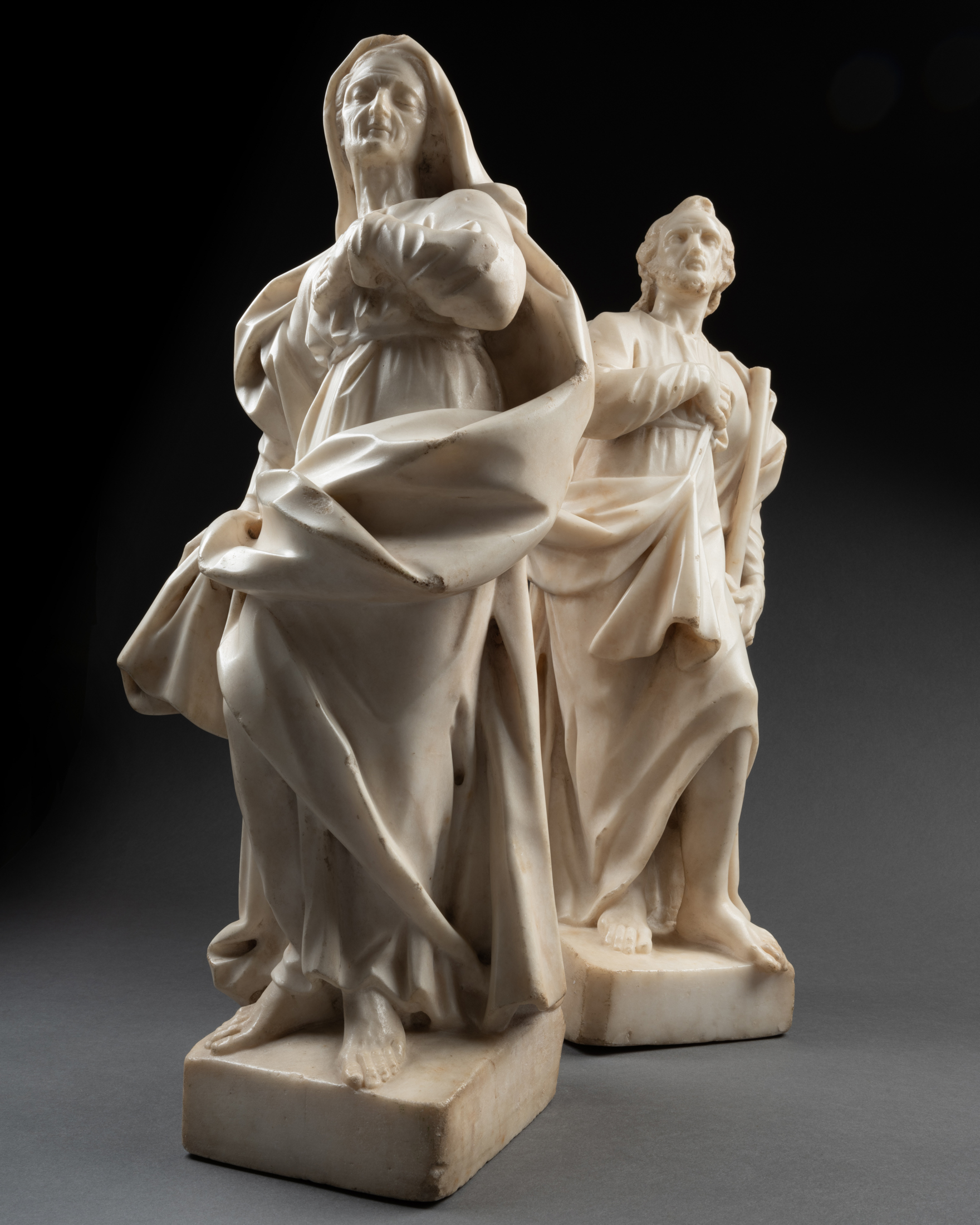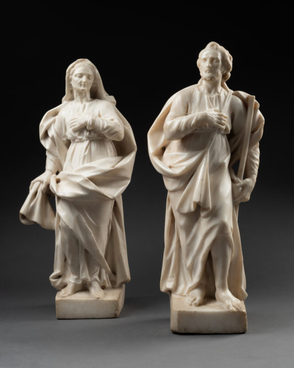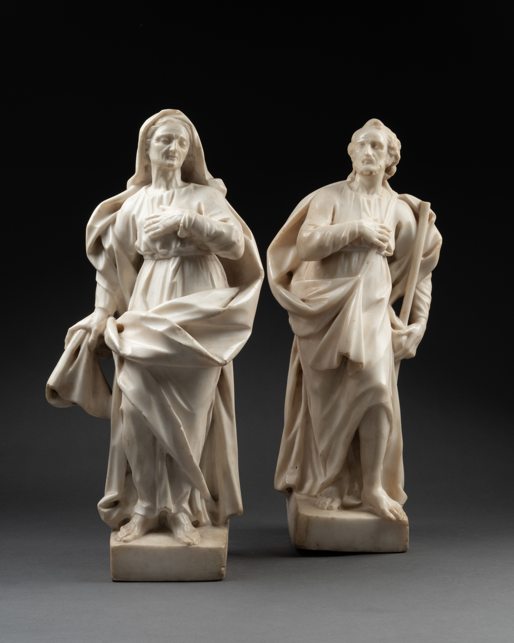 This beautiful pair of marble sculptures represents Saints Anne and Joachim, parents of the Virgin Mary. Absent from the biblical canonical texts, the figures and story of these saints come from the Greek apocryphal account of the Gospel of James, then from its Latin adaptation, the Gospel of Pseudo-Matthew. However, it was in the 13th century, thanks to the propagation of the Golden Legend by James of Voragine, that their image became established in popular culture.