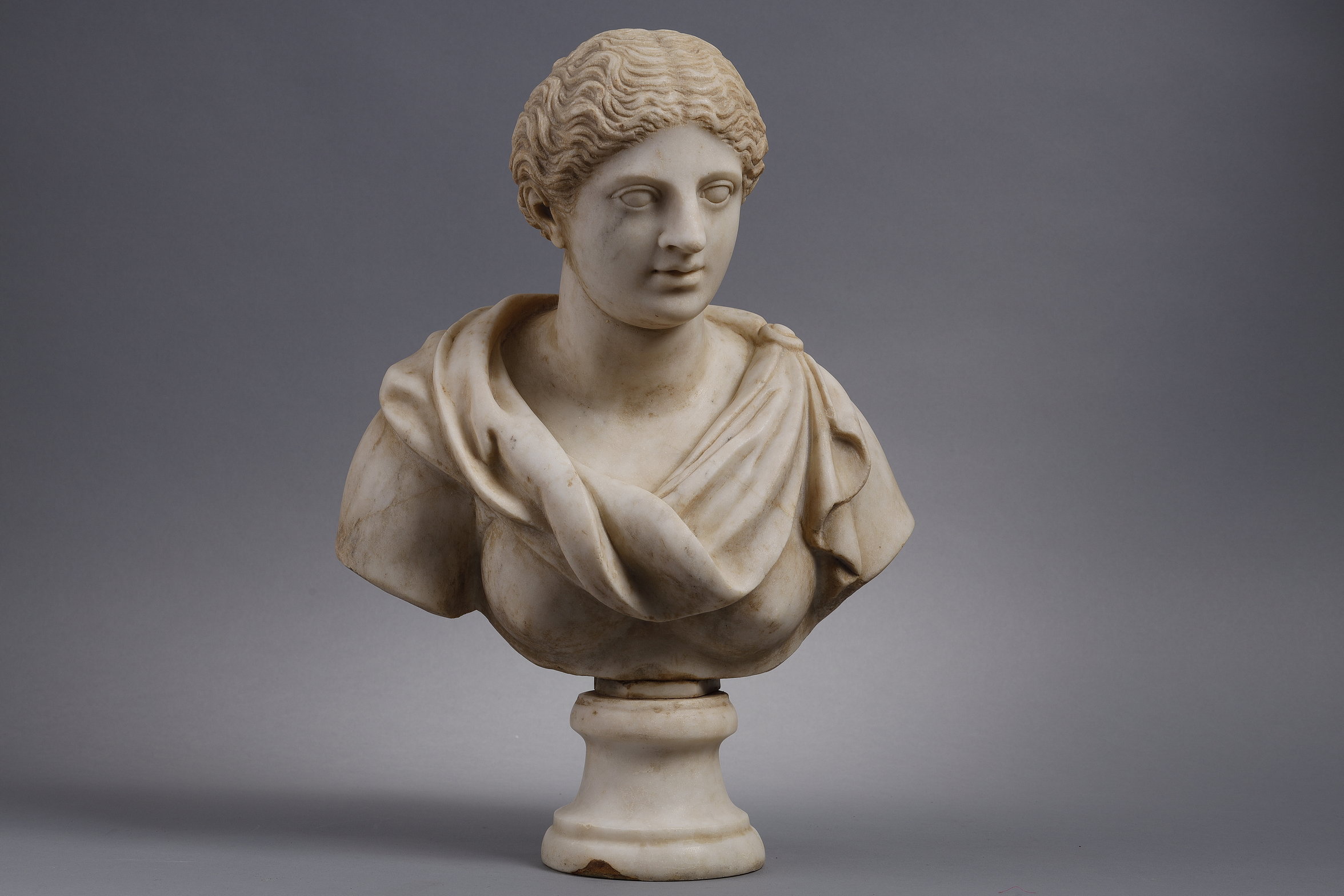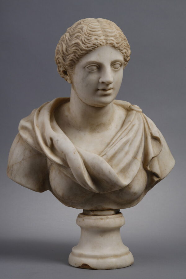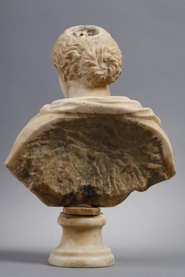 At the top of the head, a circular hole perhaps refers to the presence of a headdress or a particular use of this bust.
