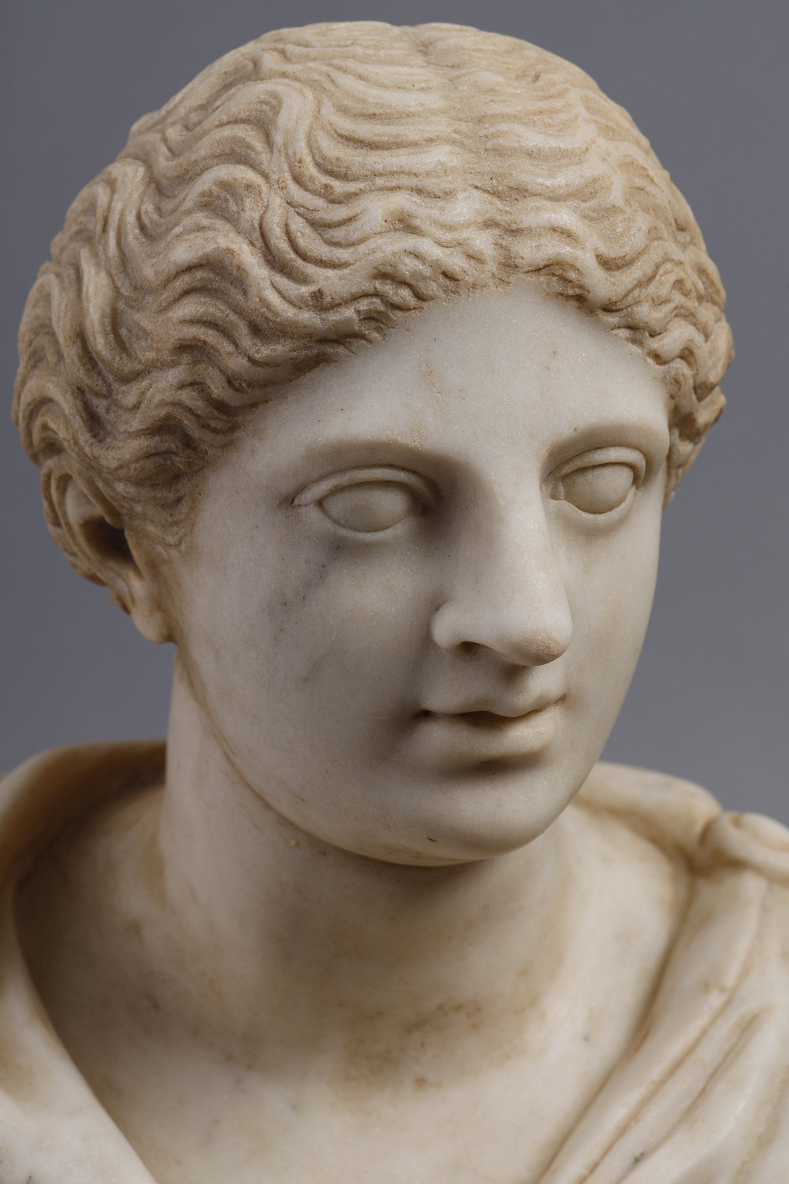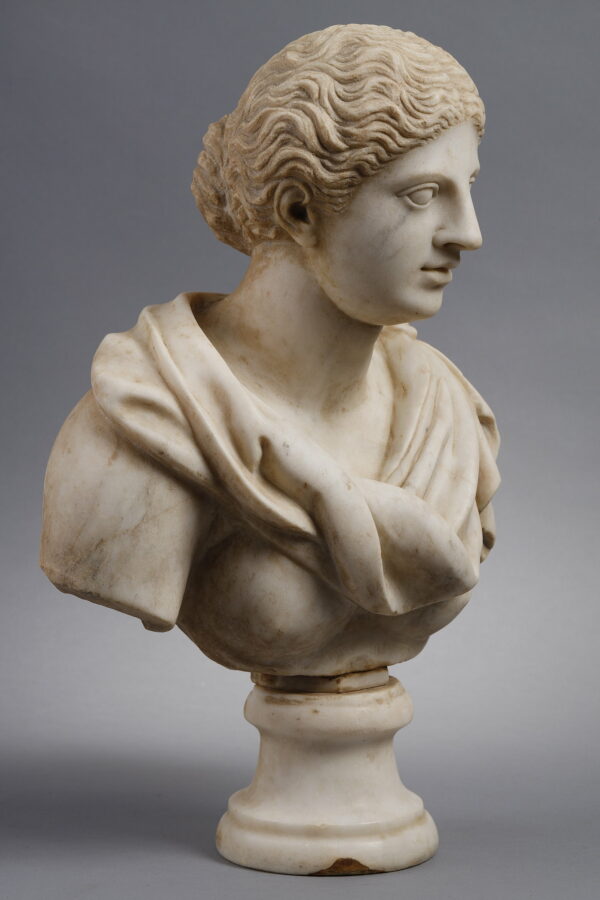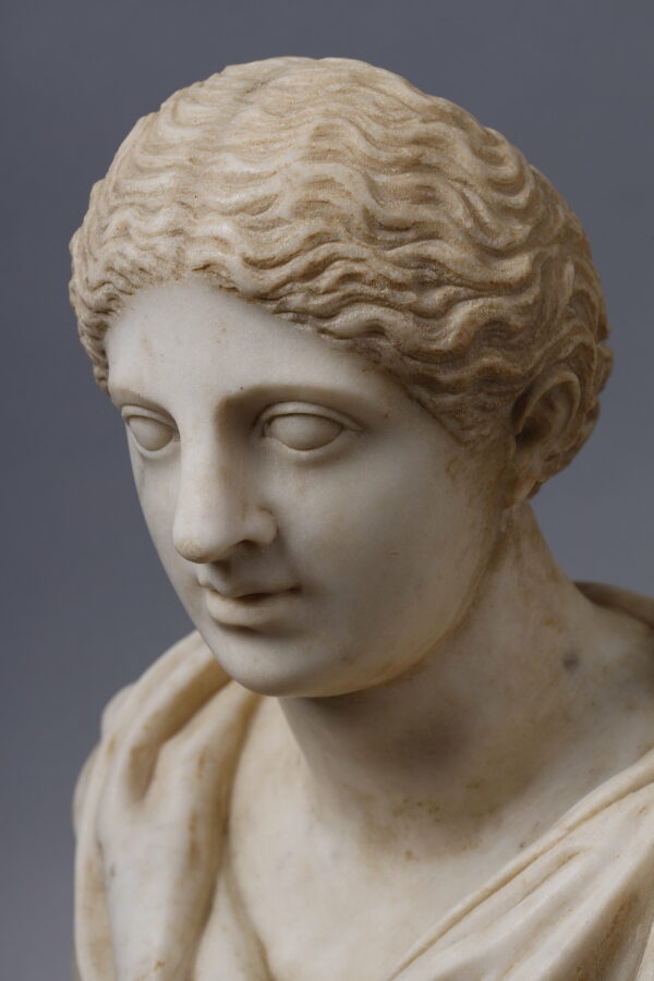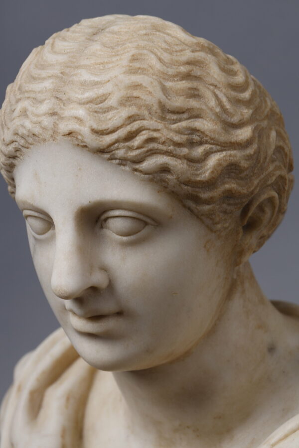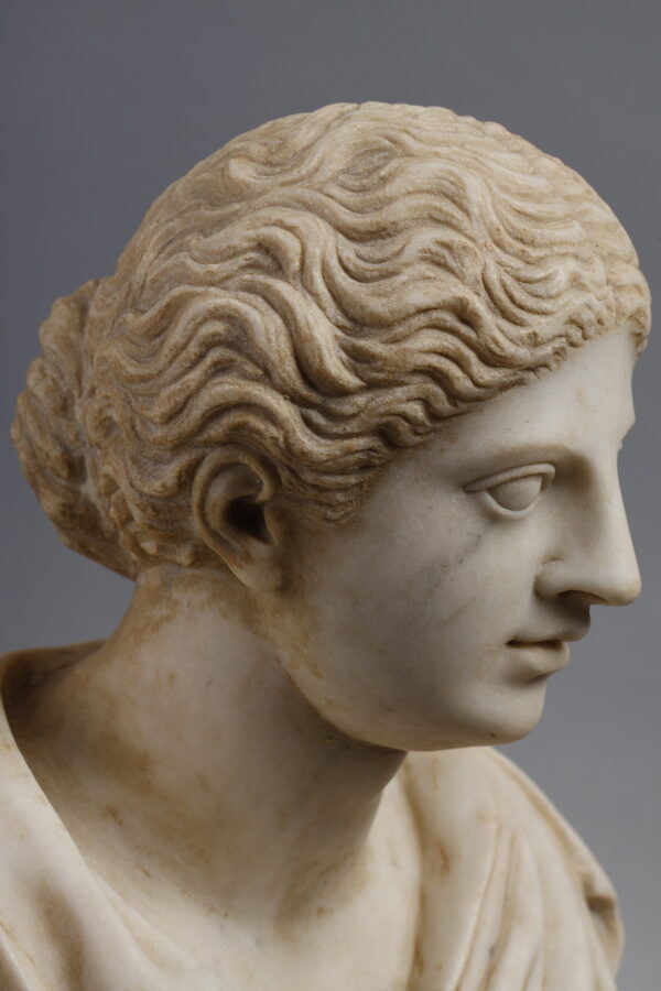 Although we can tell from the shape of her chest and the bun in her hair that she is a woman, her face appears somewhat androgynous. His slightly feminine and also slightly masculine features could raise questions for us. This is due to ancient canons of beauty which could represent young and brave men, with fine and delicate features such as those of a woman. Through these physical characteristics, their idealized beauty (proportion, symmetry, perfection) was timeless, so it could be quite difficult to recognize with certainty the genre of the sculpture based only on the head.