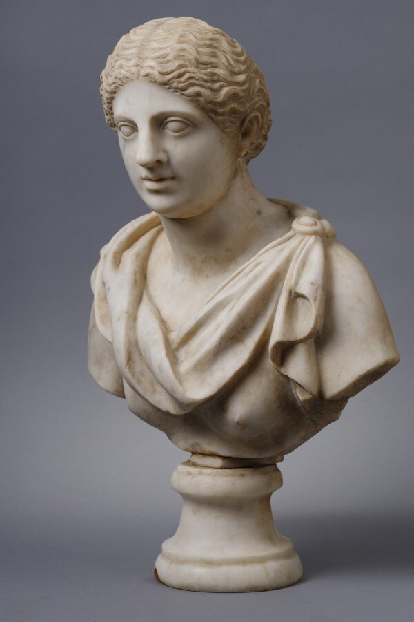 Carrara marble bust representing a woman with a toga. Resting on a Carrara marble pedestal.