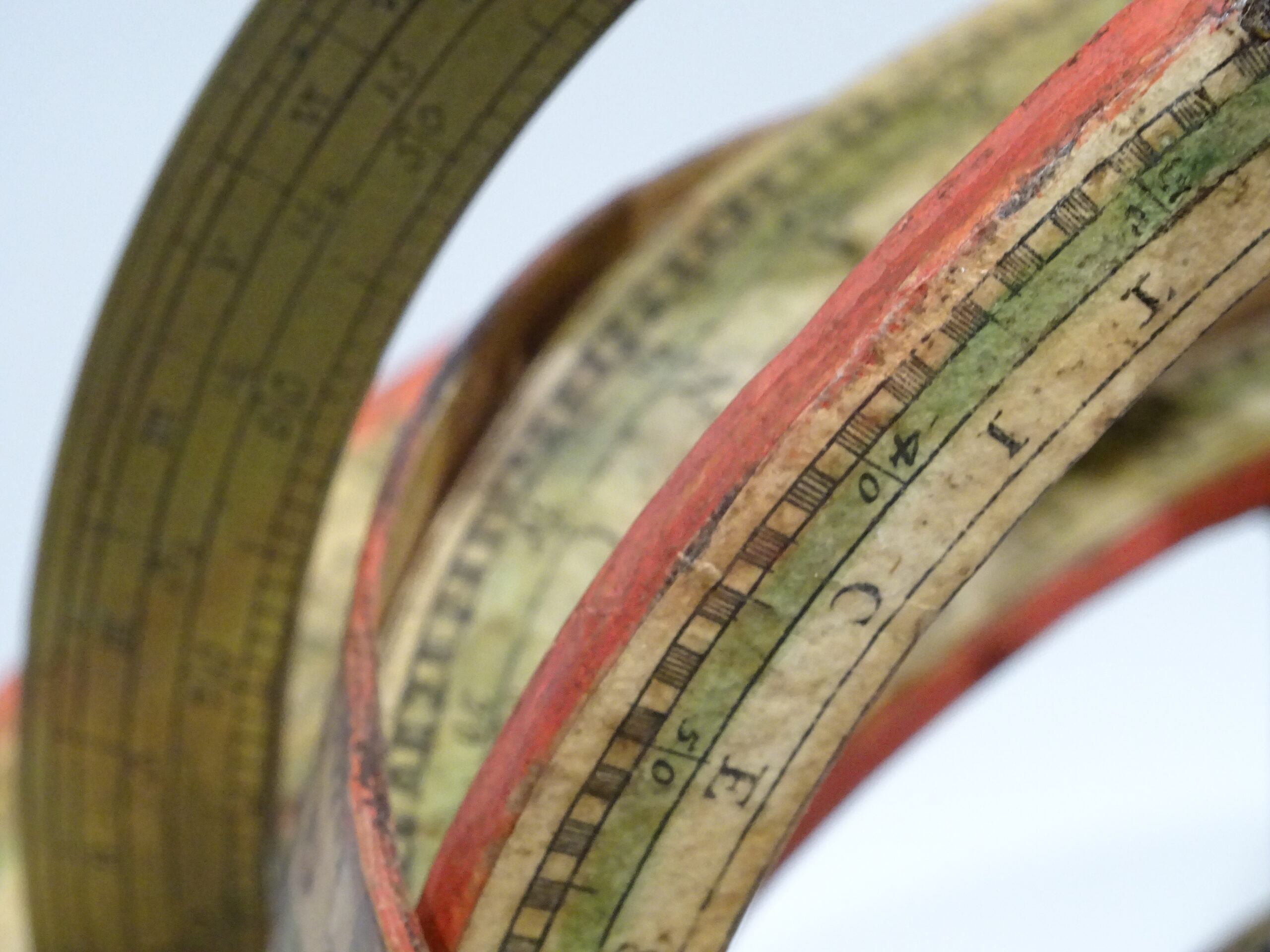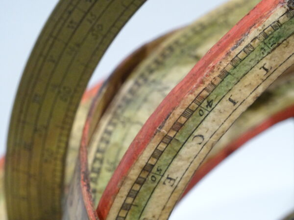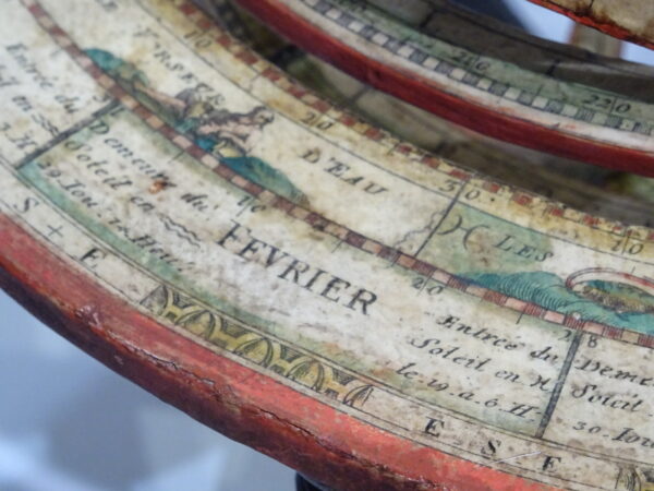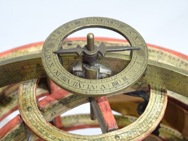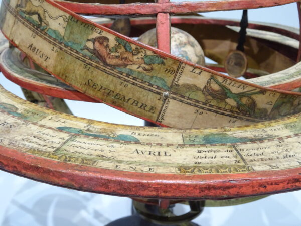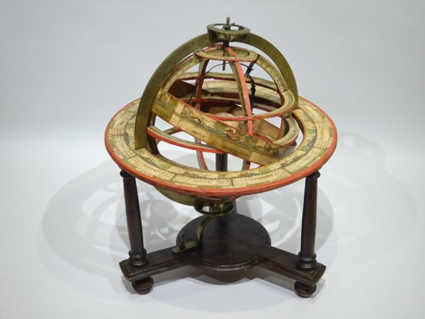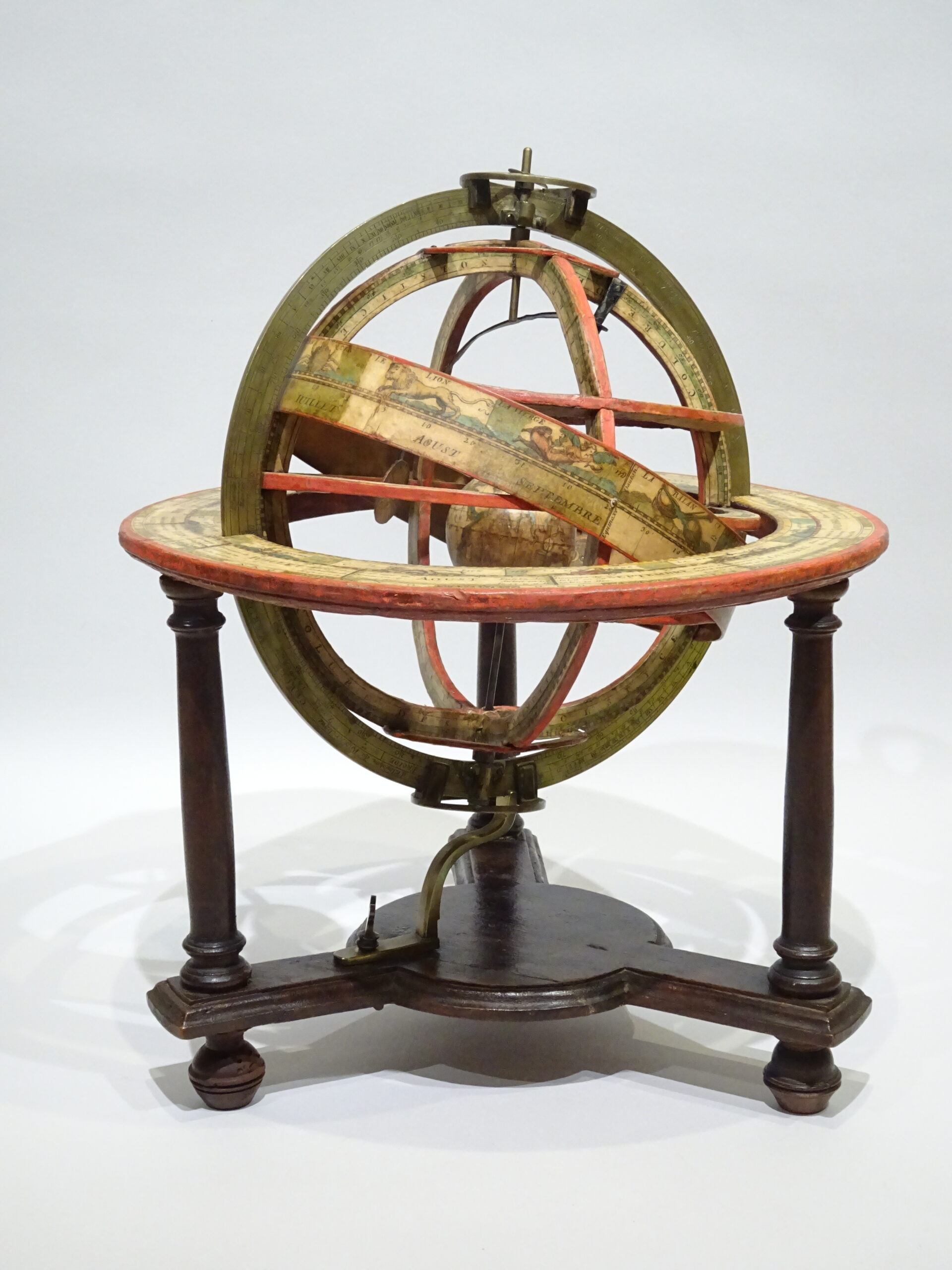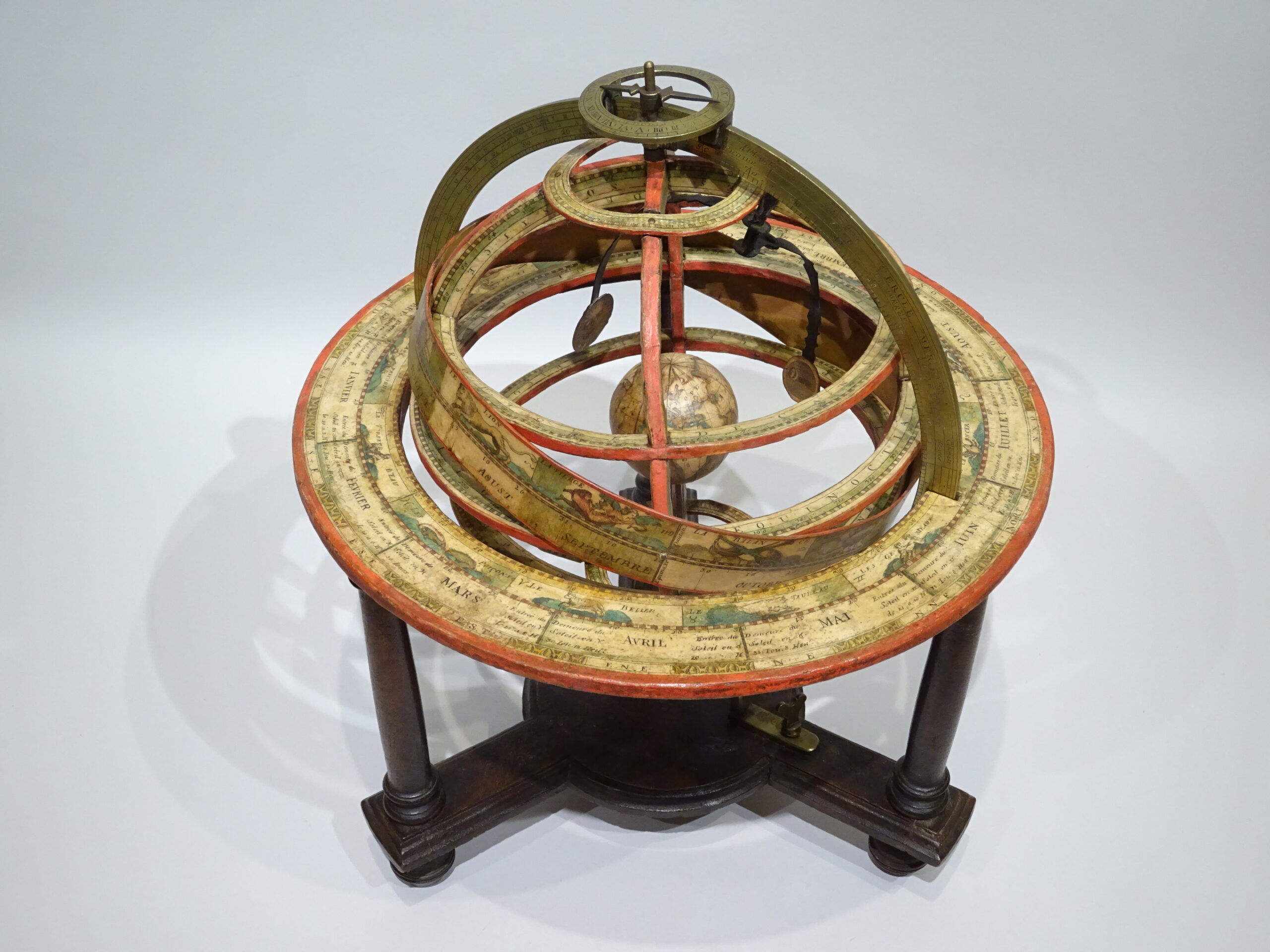 Superbe et rare sphère armillaire de type ptolémaïque, avec la Terre au centre de l’Univers, entourée de deux armilles représentant la lune et le soleil.