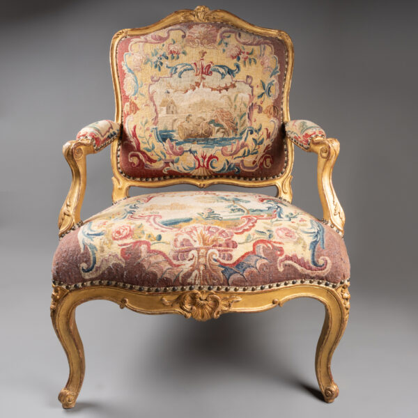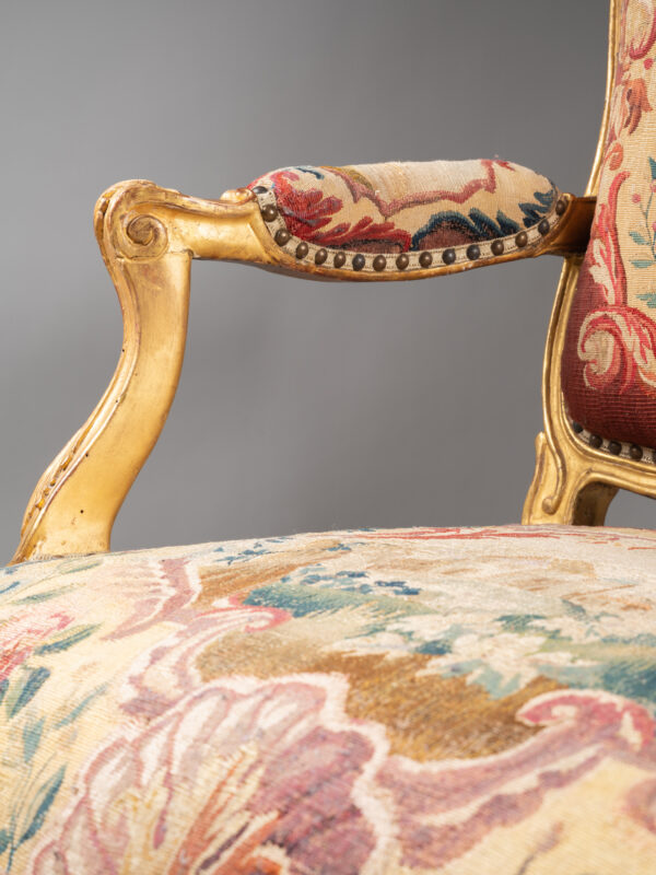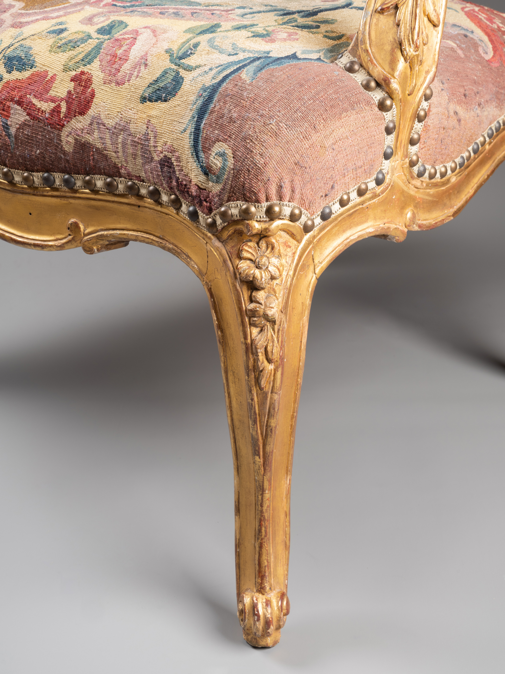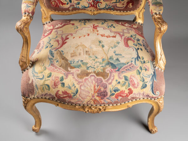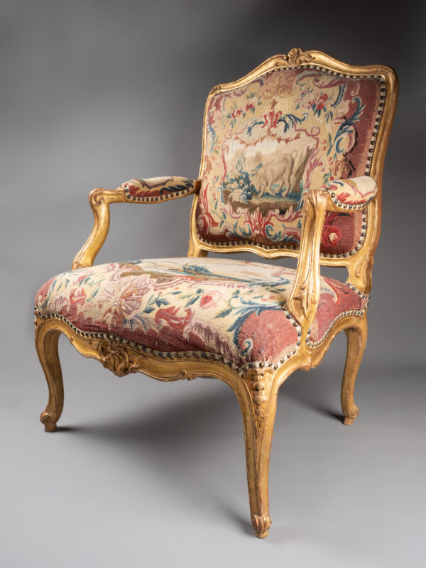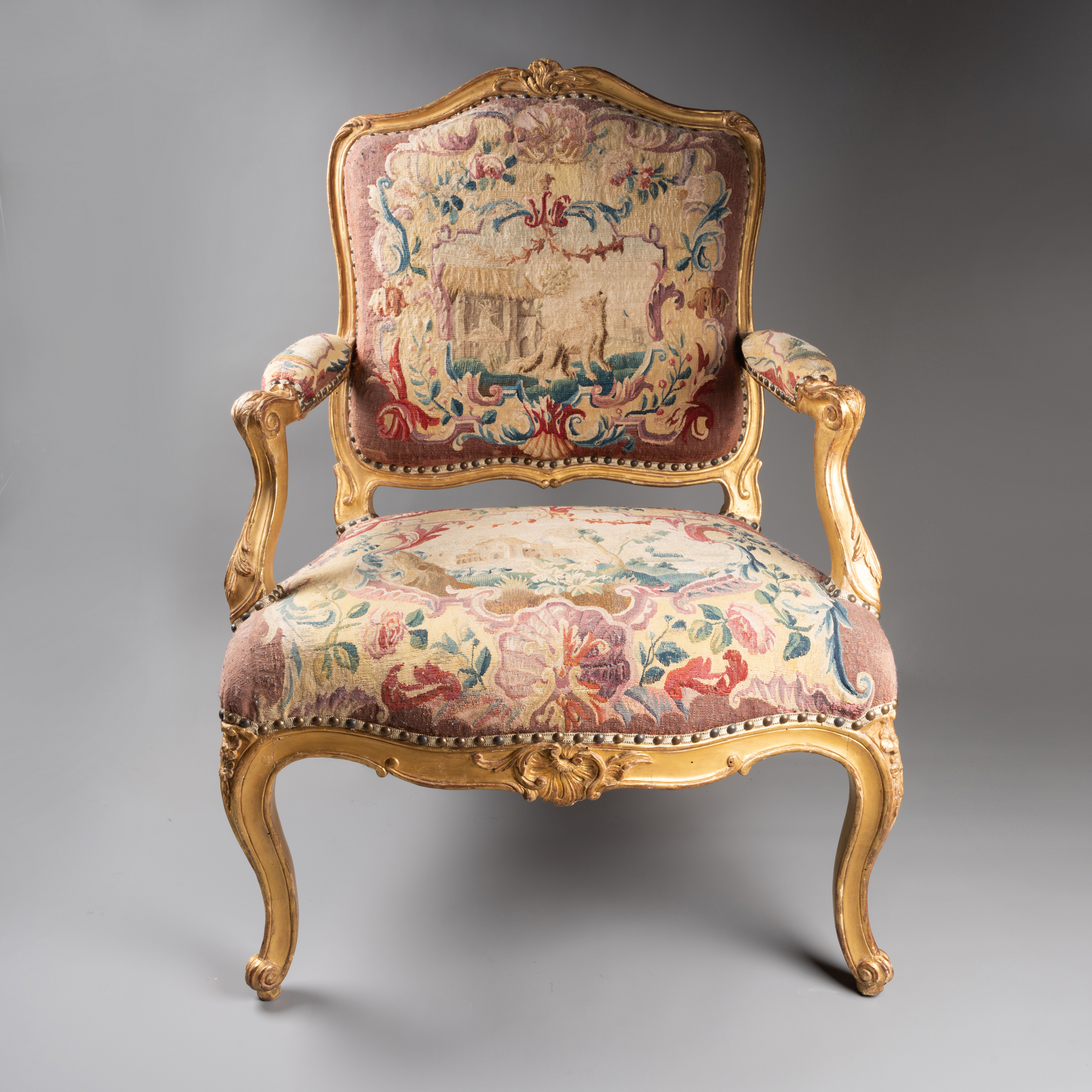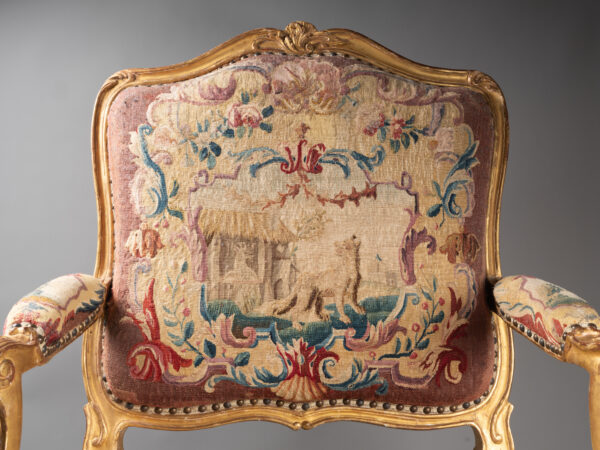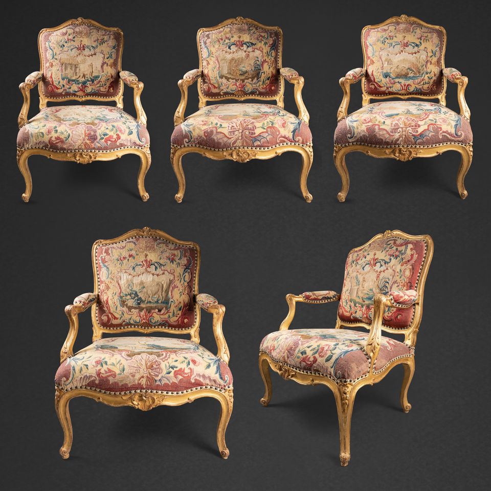 Suite de cinq fauteuils à dossier plat en bois sculpté et doré à décor de coquilles, fleurettes et feuillages. Les consoles d’accotoirs en coup de fouet, les pieds antérieurs cambrés terminés en enroulement. Garniture en tapisserie d’origine, vraisemblablement de Beauvais, à décor polychrome dans des cartouches rocaille des Fables de la Fontaine.