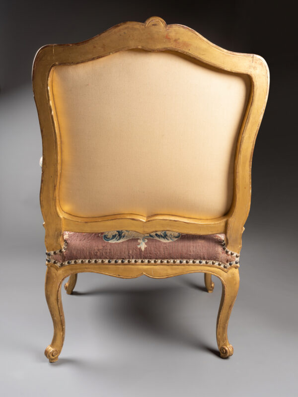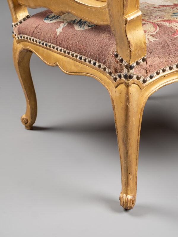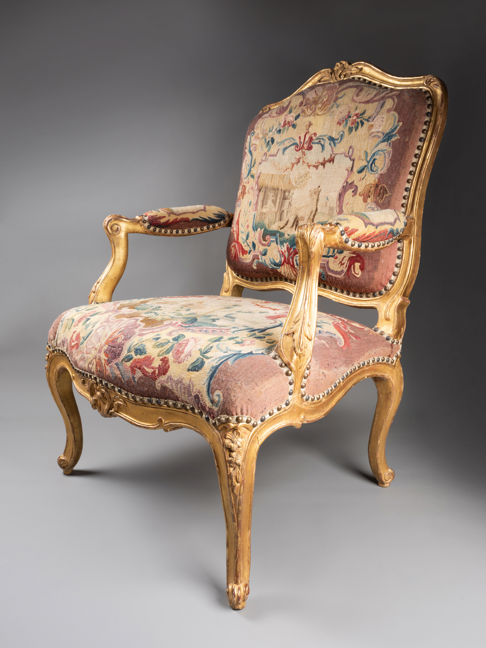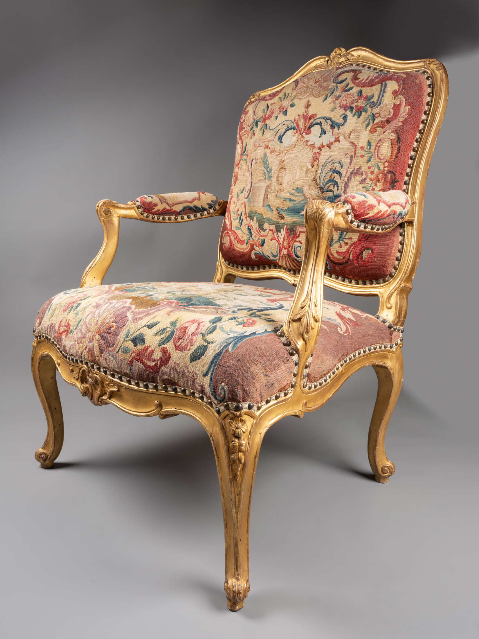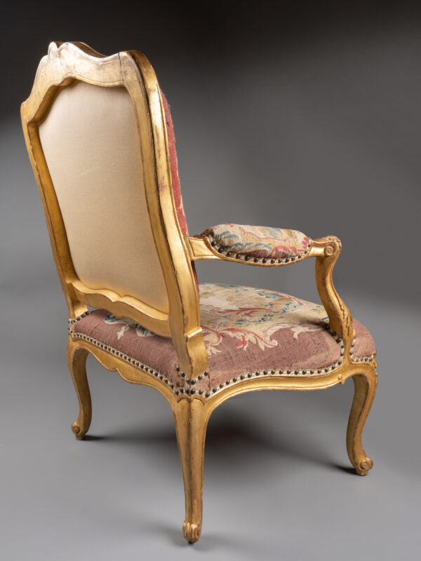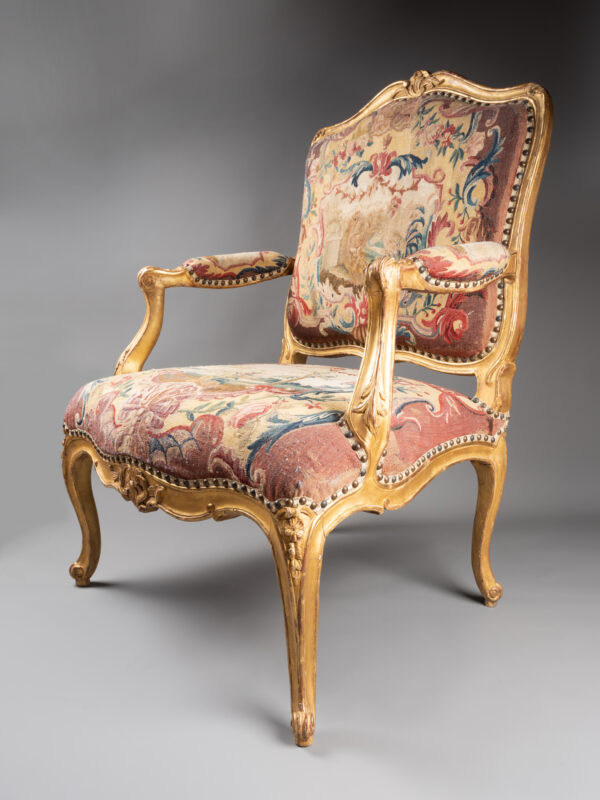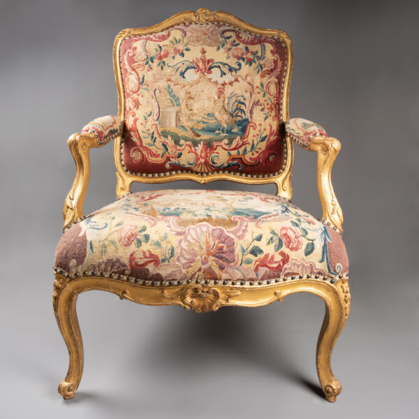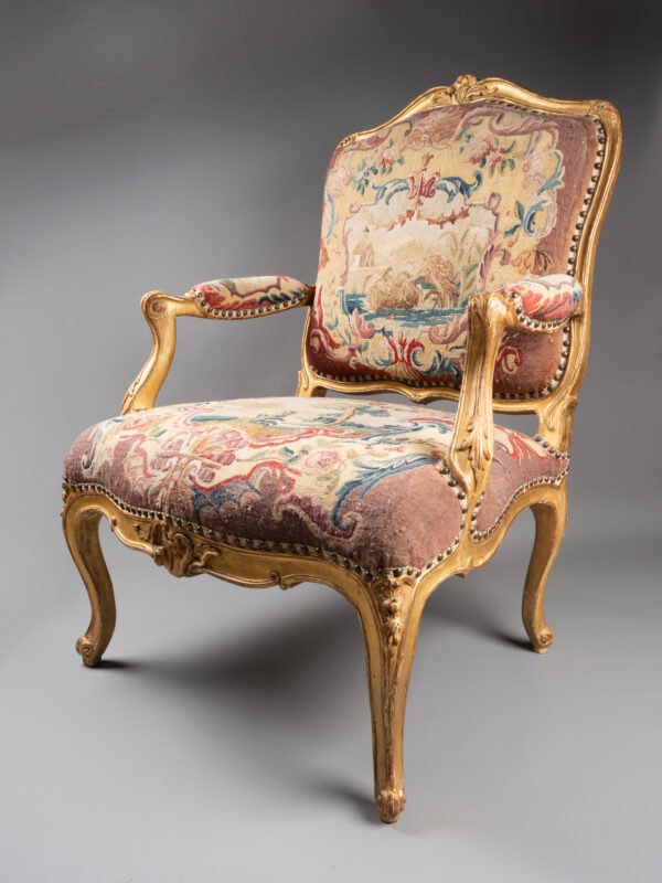 Suite de cinq fauteuils à dossier plat en bois sculpté et doré à décor de coquilles, fleurettes et feuillages. Les consoles d’accotoirs en coup de fouet, les pieds antérieurs cambrés terminés en enroulement. Garniture en tapisserie d’origine, vraisemblablement de Beauvais, à décor polychrome dans des cartouches rocaille des Fables de la Fontaine.