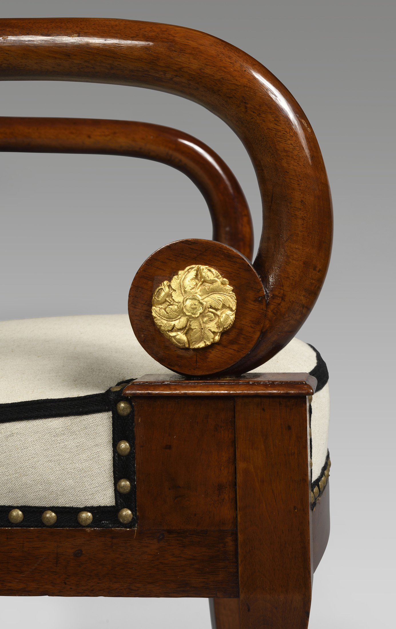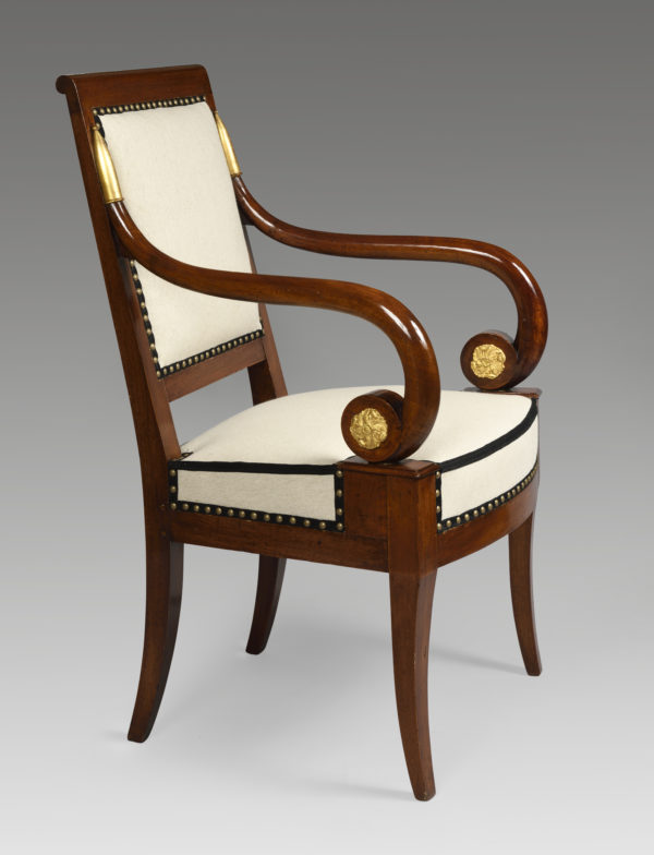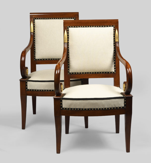 Suite de quatre fauteuils en acajou et placage d’acajou à dossier rectangulaire. Descente de bras en crosse, pieds arrières en sabre. Ornementation de rosaces feuillagées et fleuries.