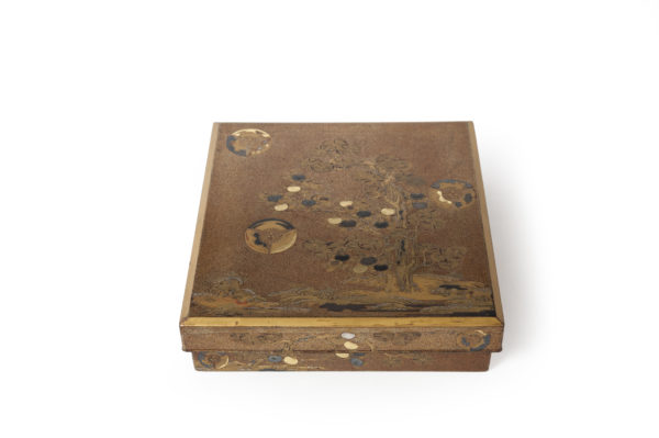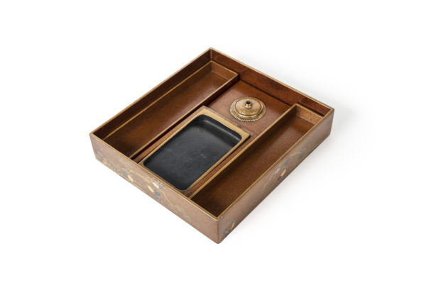 Décoré d’un motif de clématites et d’arbres à kakis en maki-e sur fond nashiji. Mosaïque d’or (kirigane) sur le tronc, les branches de l’arbre et les rochers au premier plan. Le suzuribako contient une pierre à encre, un godet à eau, et deux compartiments latéraux en laque nashiji. Le fond du couvercle présente un décor analogue à celui qui se trouve sur le dessus de ce dernier. Un môn (armoirie) composé de trois éventails formant un cercle parfait est représenté à trois reprises sur le couvercle de la boîte et sur le fond du couvercle.