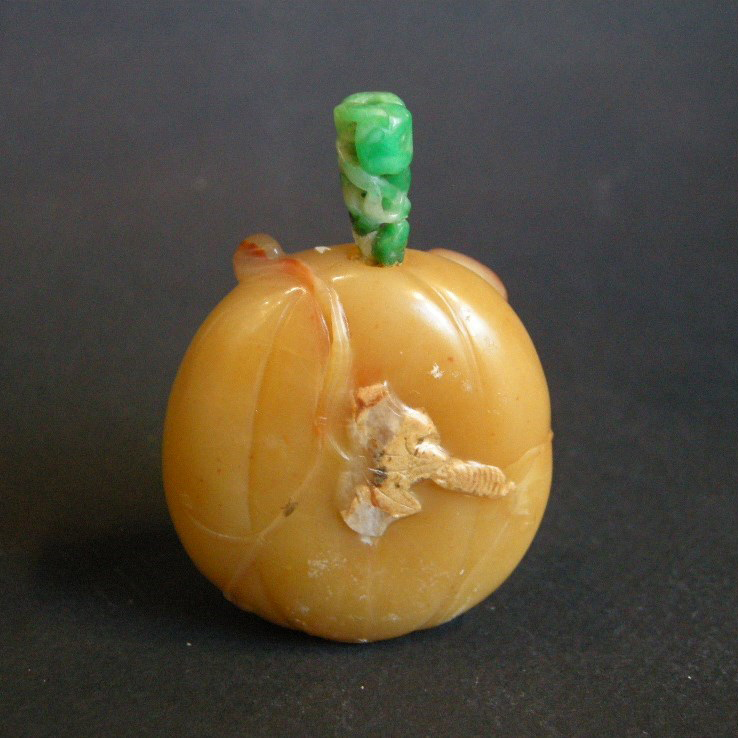 Tabatière en agate beige et brune en forme de melon avec son feuillage sculpté en léger relief.