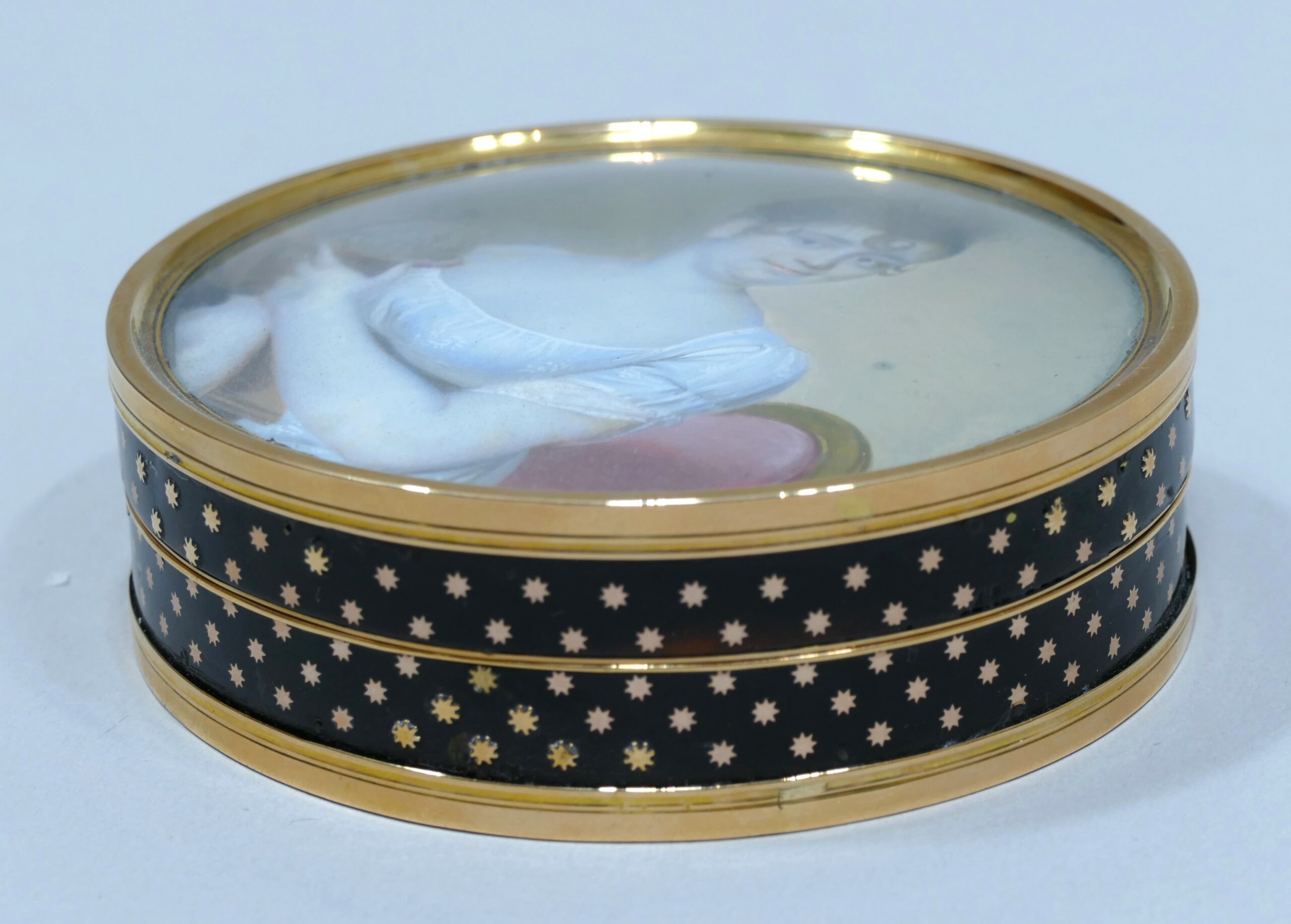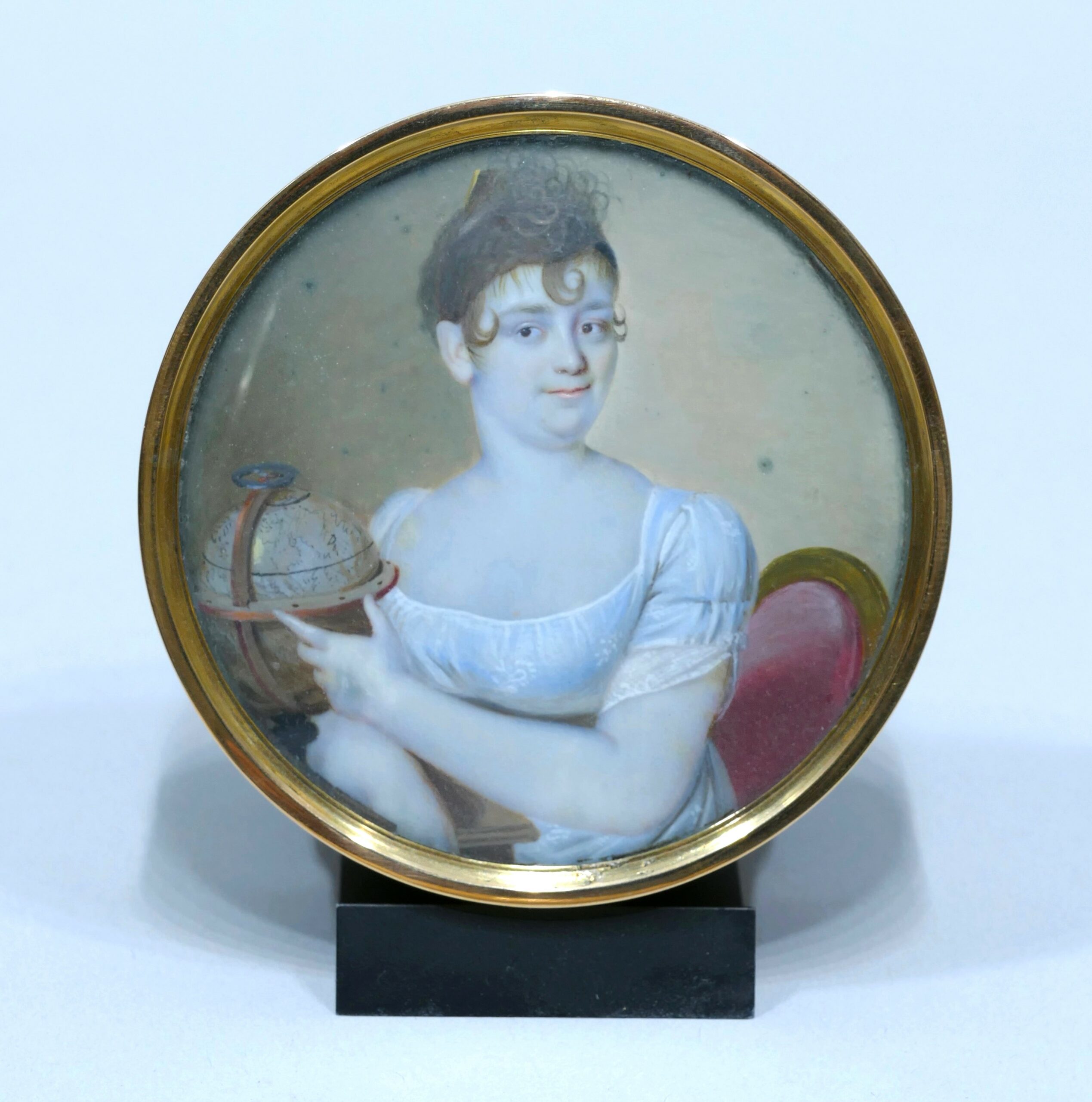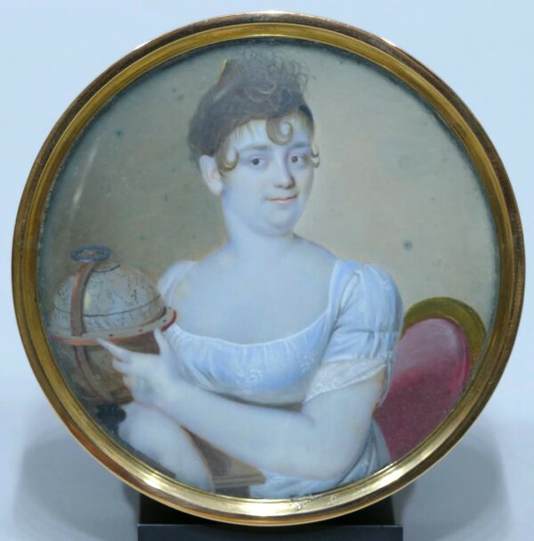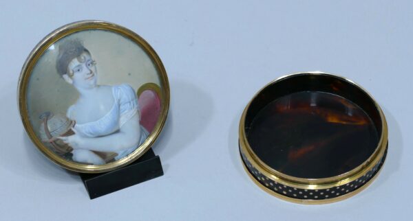 Tabatière de forme ronde en écaille et or orné d’une miniature représentant une jeune femme assise et accoudée montrant un globe de sa main gauche.