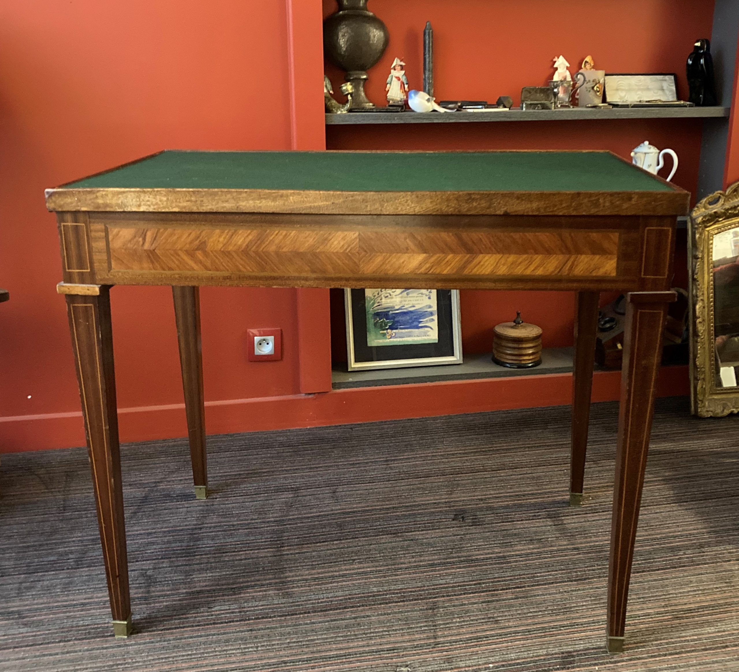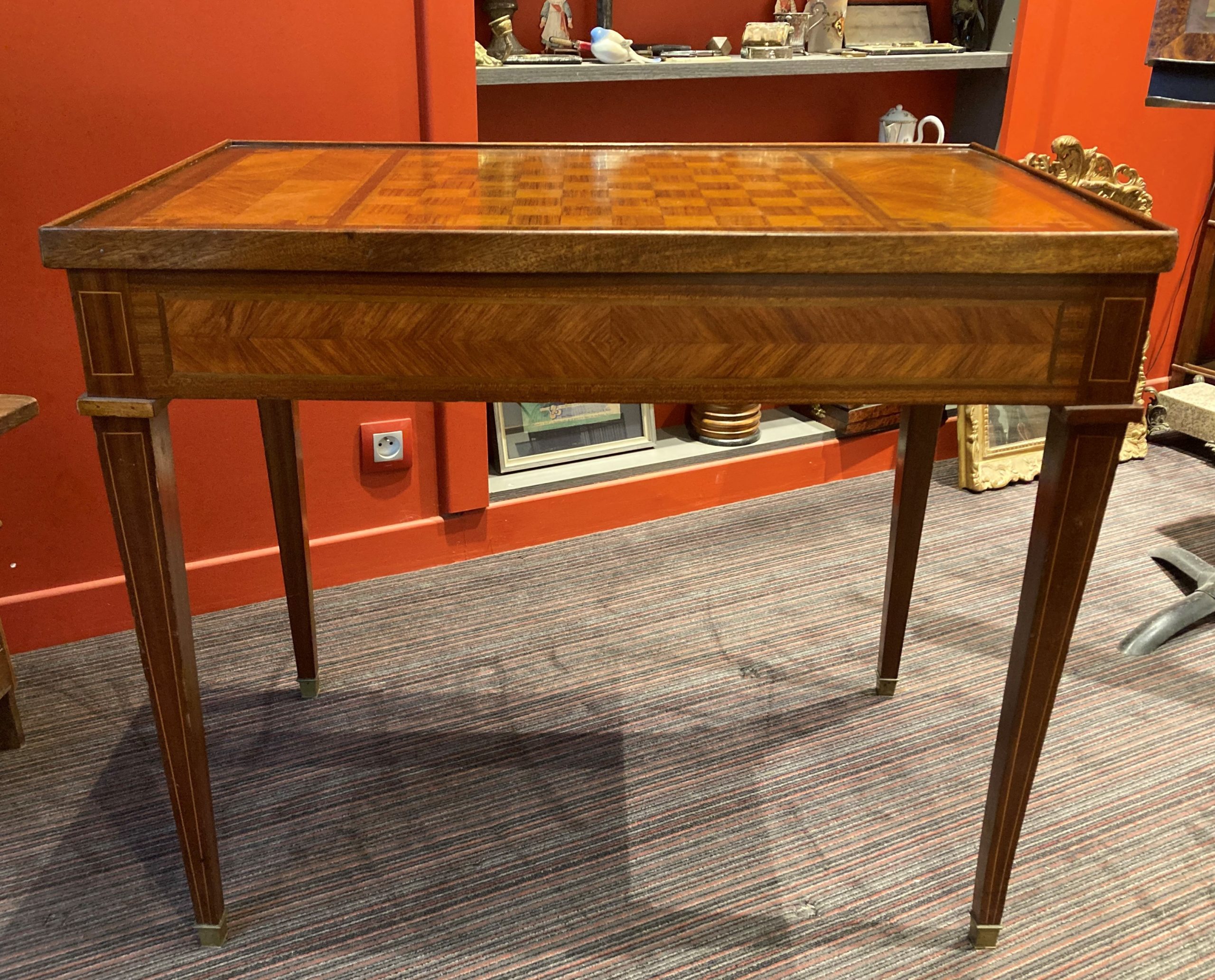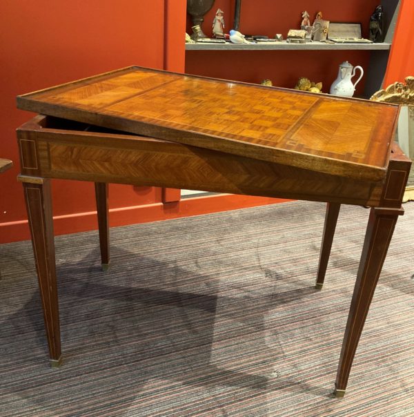 Table à jeu en bois, placages de palissandre, d’acajou et filets de bois clair, sabots en bronze doré.