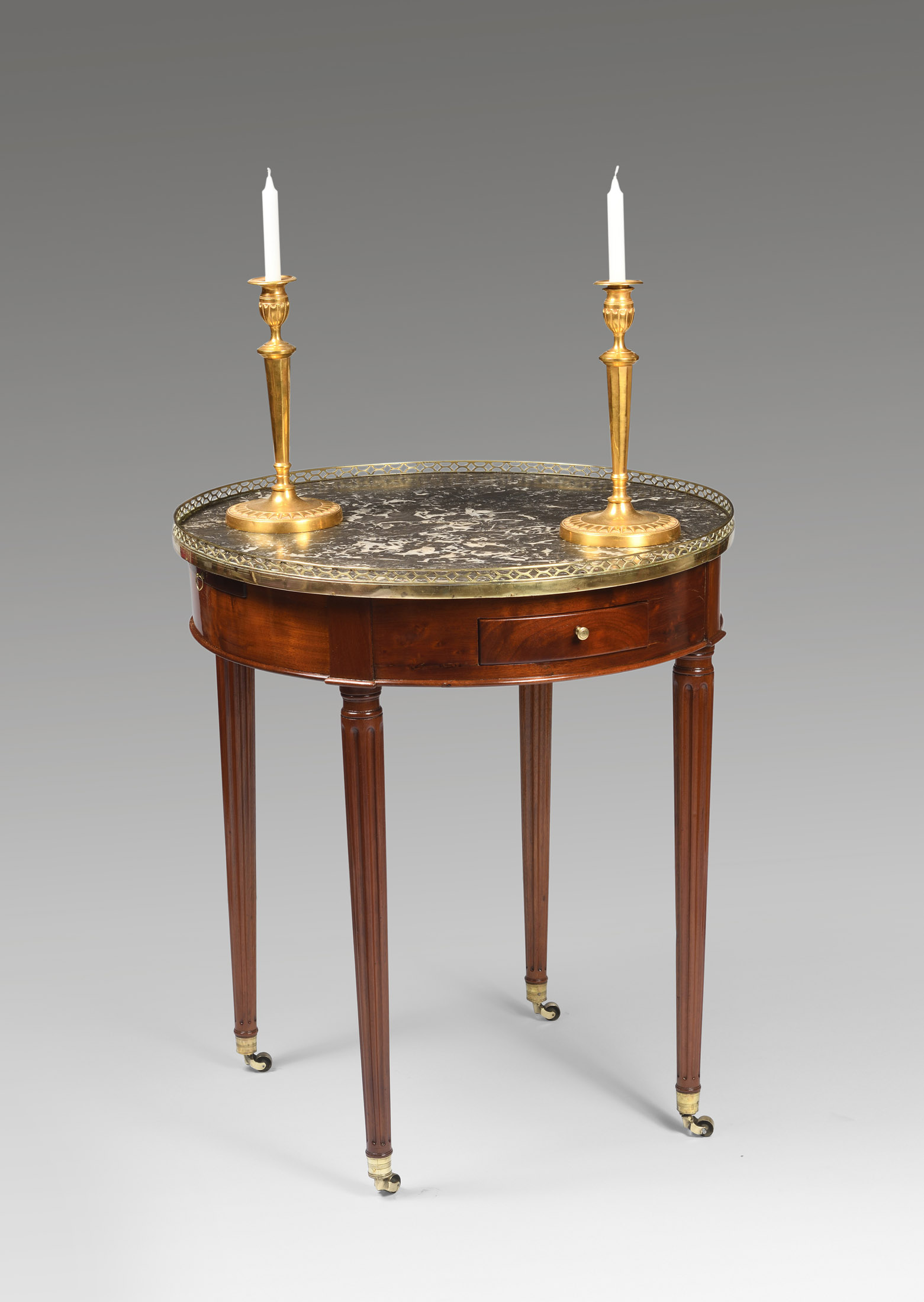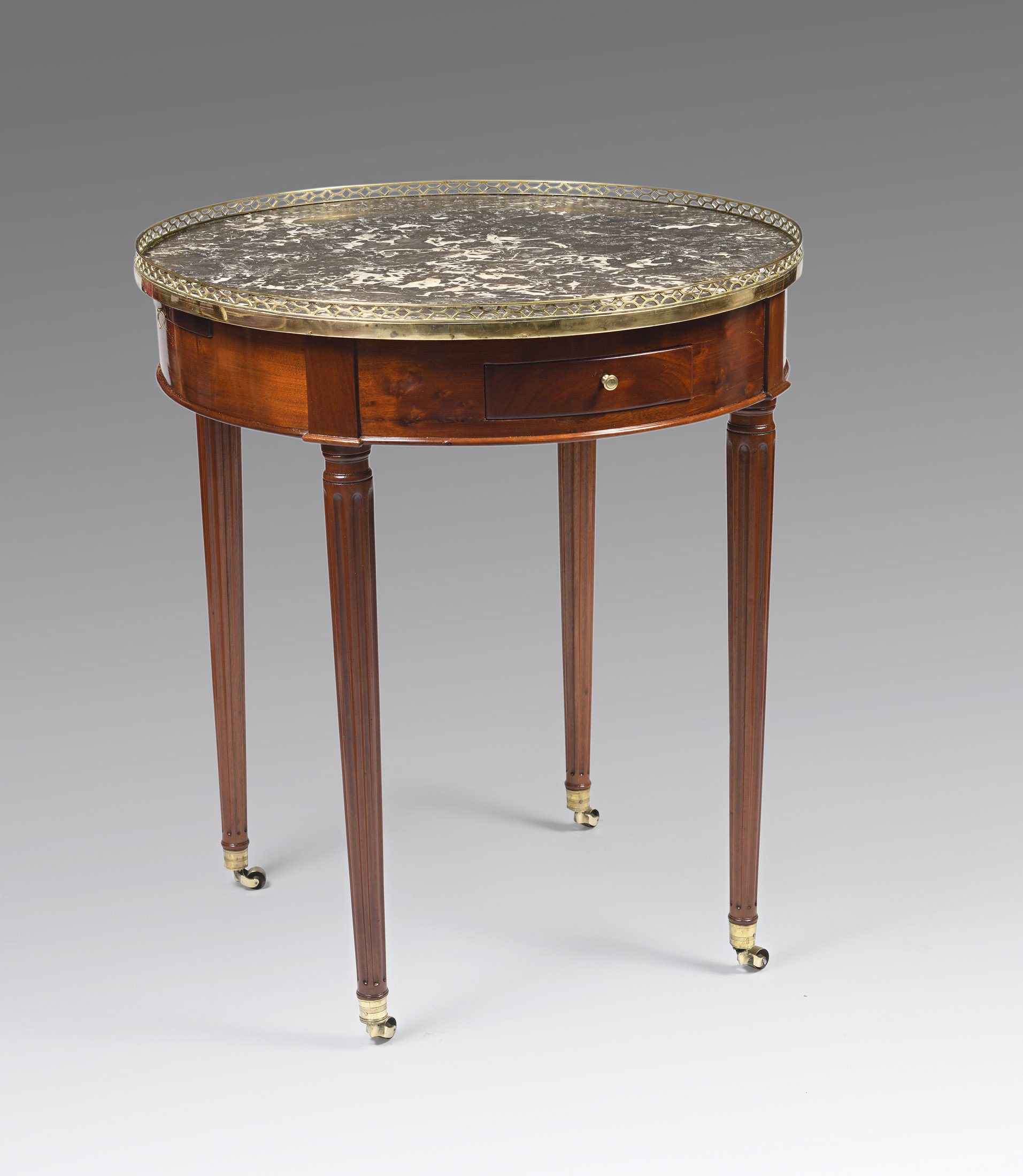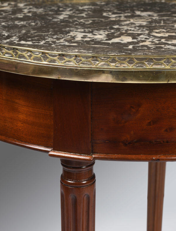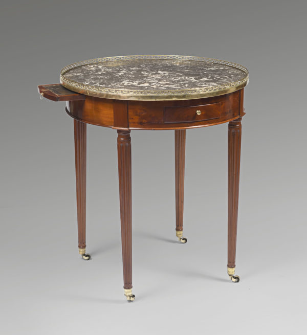 Table bouillotte en acajou et placage d’acajou. Pieds fuselés et cannelés. Elle ouvre par deux tiroirs et deux tirettes dans la ceinture. Ornementation de bronzes dorés. Galerie, anneaux, boutons et sabots. Dessus de marbre Sainte-Anne .