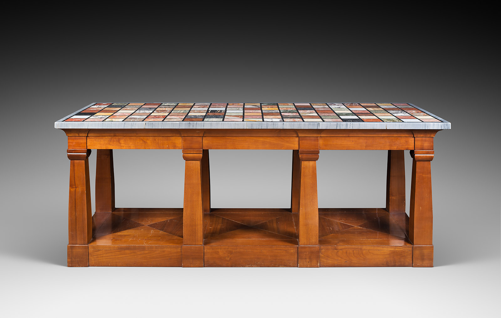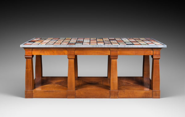 The rectangular specimens marble top, above a veneered fruitwood pedestal with eight-squared tapering legs, joined together by a large plinth.