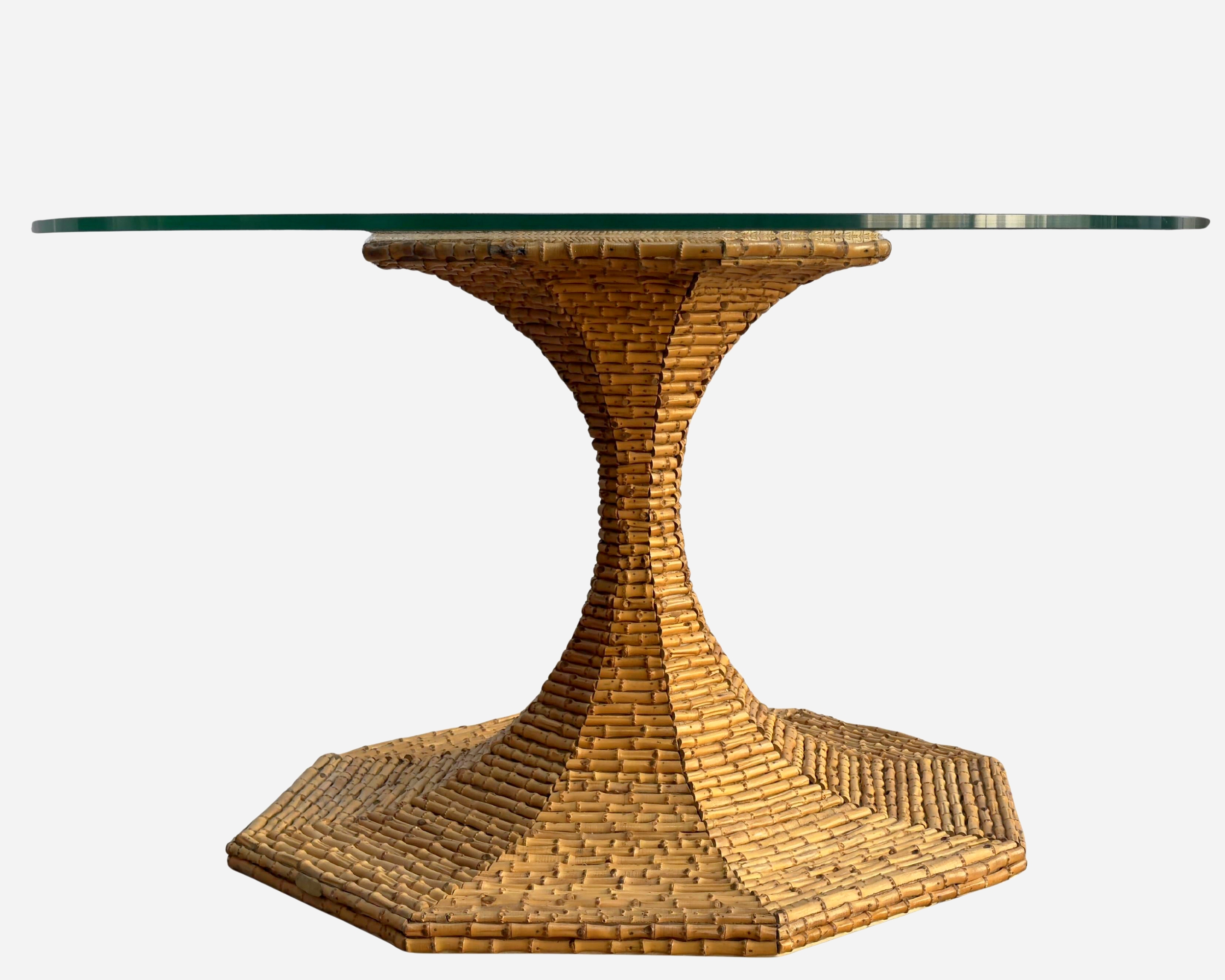 A high table with an attractive octagonal base covered in split bamboo, and a round top in clear glass.