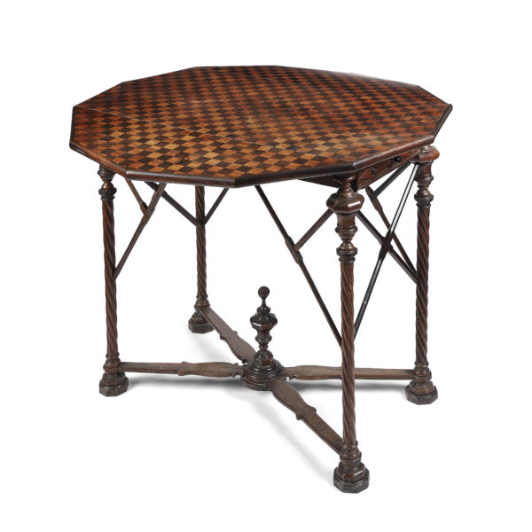Table in rosewood and exotic wood, chequered top with 2 decagon-shaped flaps, 2 side drawers, a spacer with a top in its centre. Turned legs.