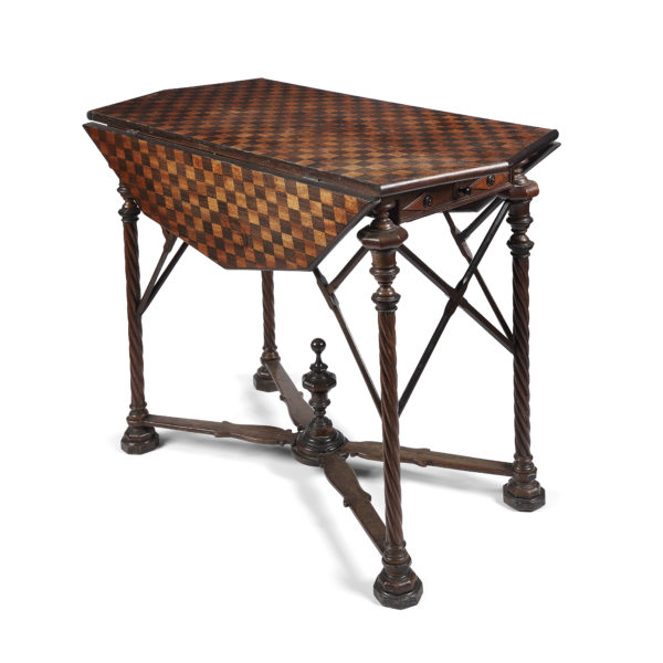 Table en palissandre et bois exotique, plateau à damier à 2 abattants de forme décagone, 2 tiroirs latéraux, une entretoise avec une toupie en son centre. Jambages tournés.