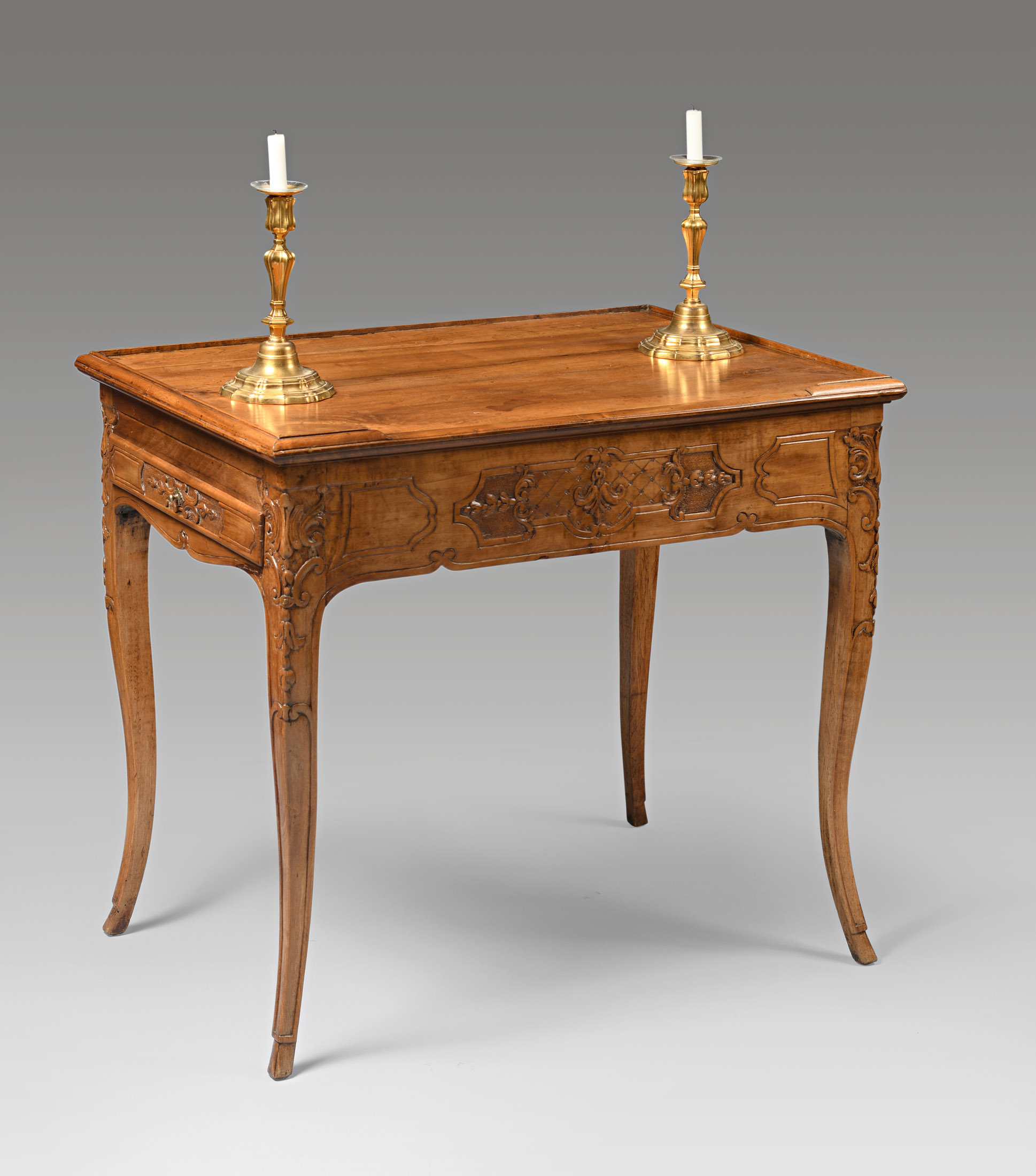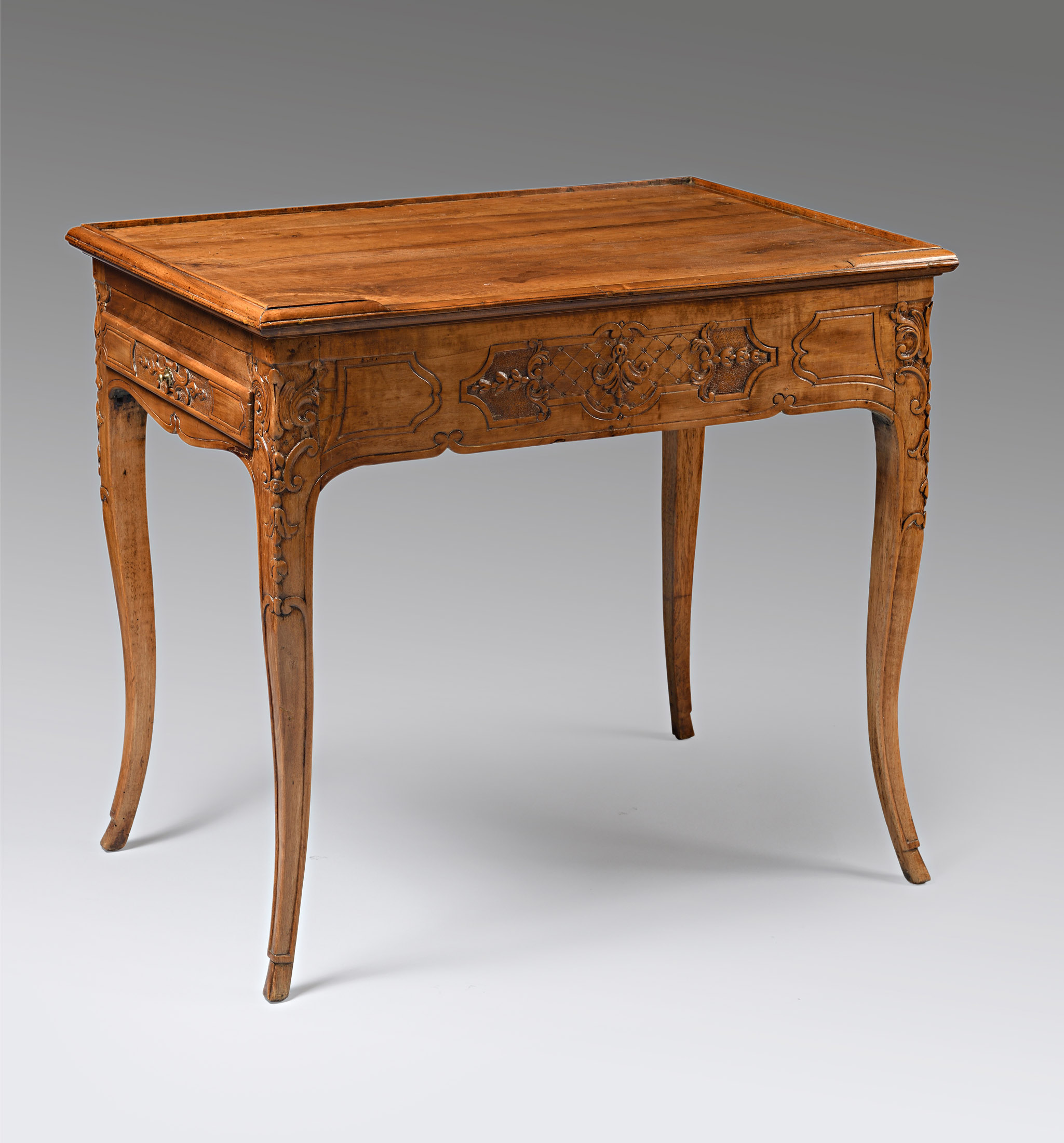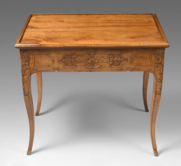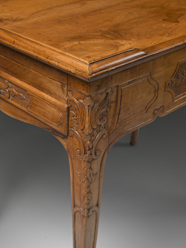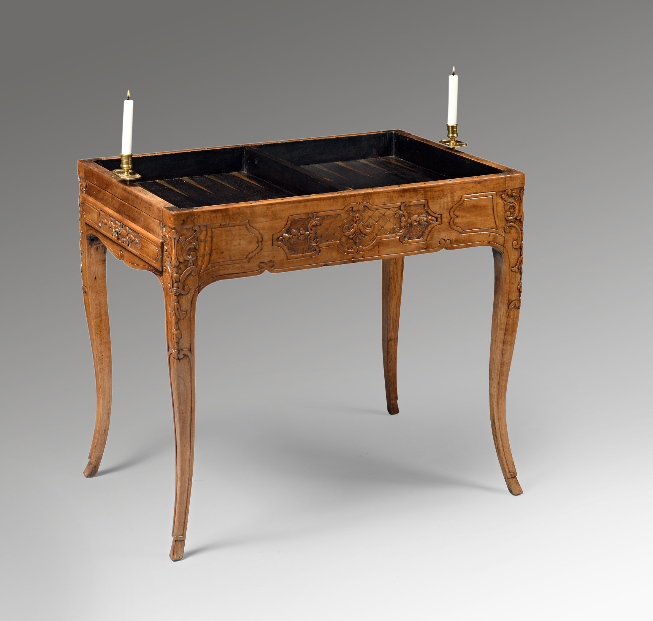 Table tric trac en noyer massif ouvrant par deux tiroirs. Pieds galbés. Dessus mobile présentant côté cuir et l’autre bois faisant écritoire. Ornementation de rinceaux, moulure, fleurs. Bout des pieds simulant des pieds d’animaux.