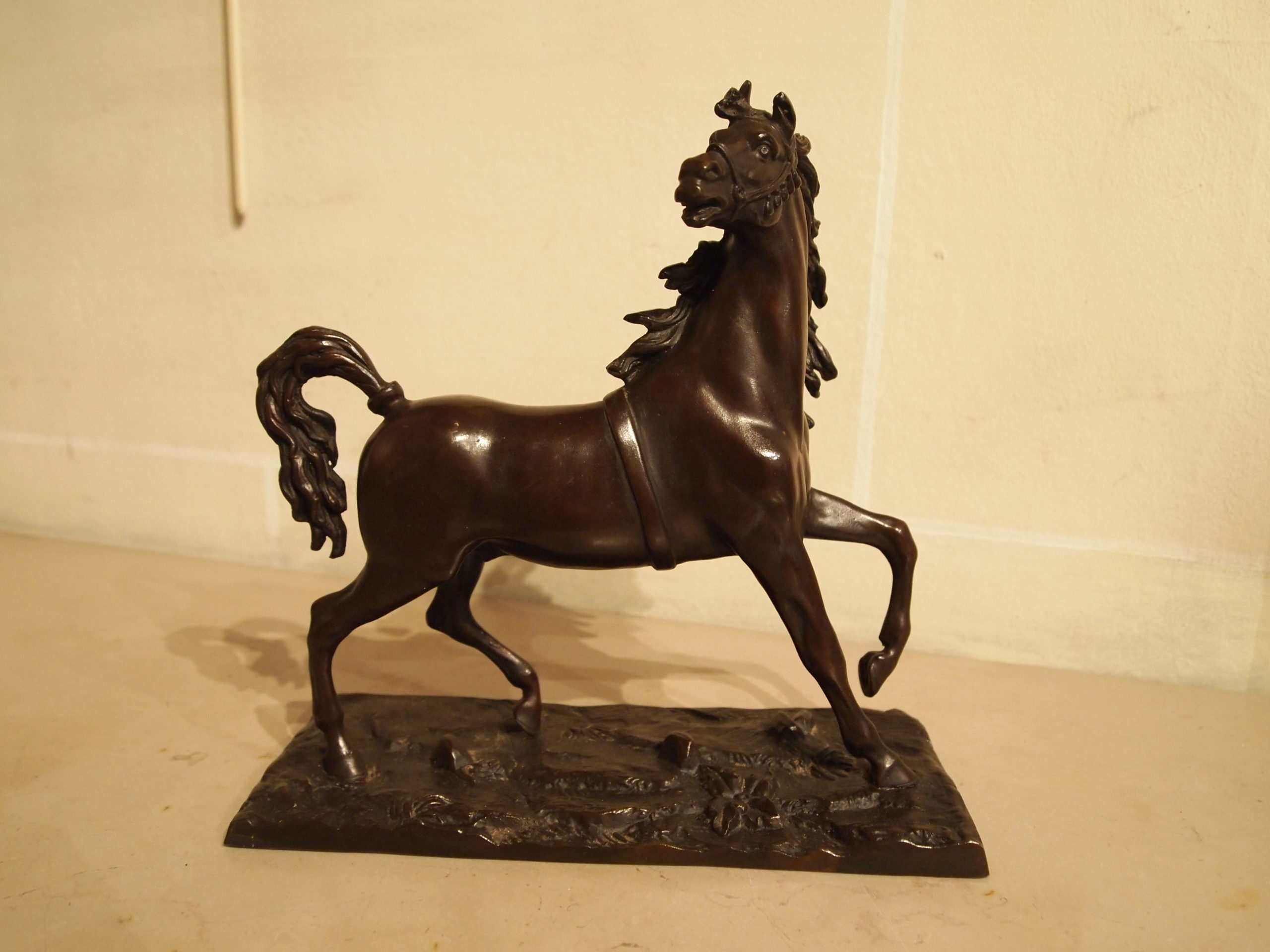 Ce cheval est en bronze à patine brune. Si sa facture peut sembler classique, sa crinière au vent donne un ravissant volume à l’œuvre et une touche de modernité.