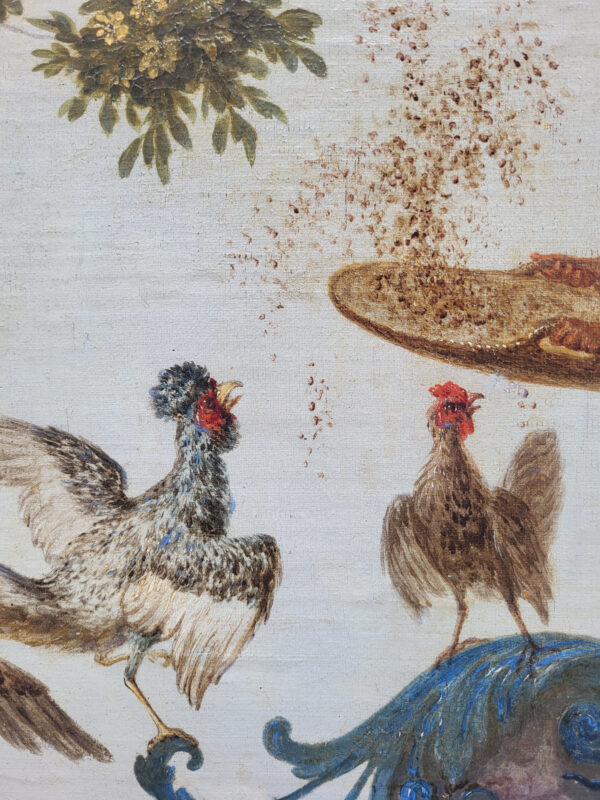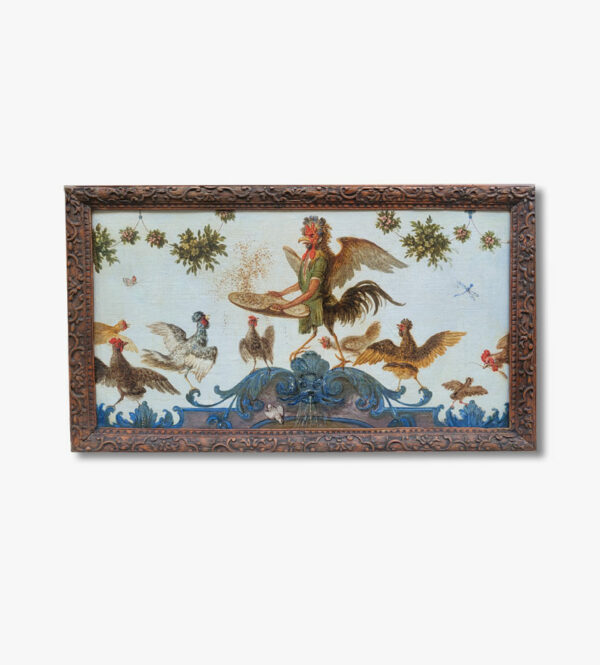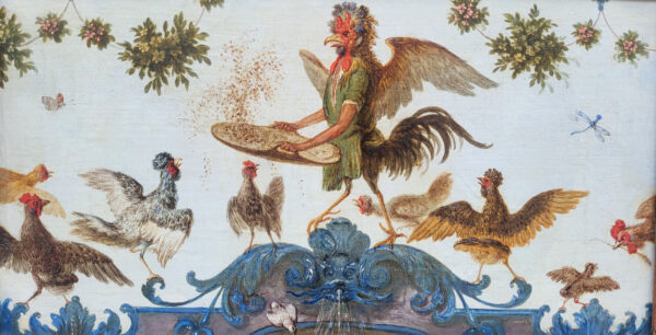 L’oeuvre représente un grand coq, debout en position anthropomorphe, versant de la nourriture depuis une grande coupe vers un groupe de poules et de poussins qui s’agitent autour de lui.