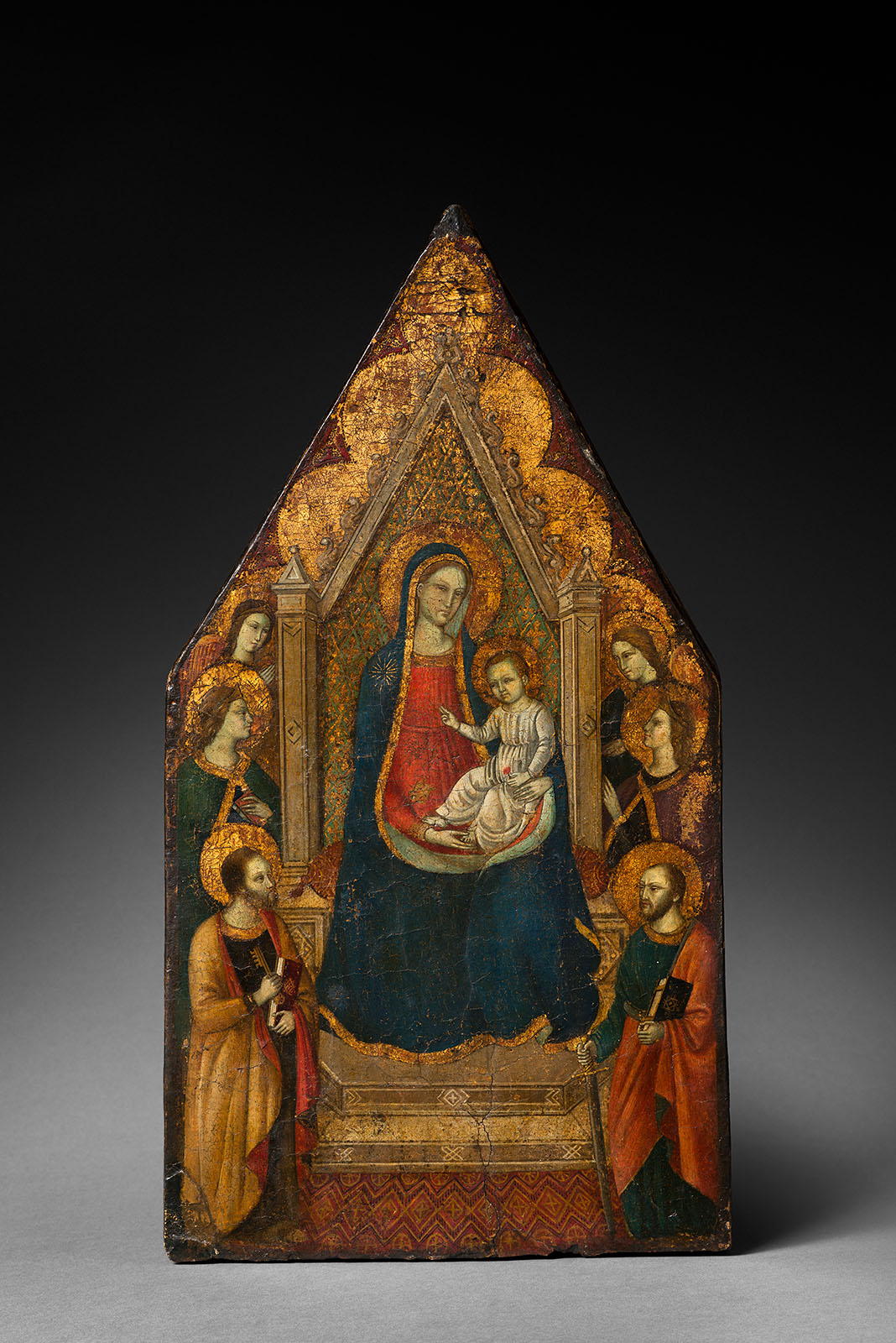 La Vierge siège sur ce trône, alors représentée en Maestà, c’est-à-dire, Vierge en Majesté. Un profond intérêt est conféré à son attitude maternelle. En effet, la Mère de Dieu, tient son divin Enfant dans ses bras, assis sur ses genoux, avec une grande douceur. Elle est vêtue d’une belle robe rouge et couverte du traditionnel manteau bleu, allant de sa tête à ses pieds, dans lequel elle enveloppe tendrement le Christ. L’Enfant Jésus fait un signe de bénédiction avec sa main droite et tient un oeillet rouge dans sa main gauche. Cette fleur serait née, selon la légende, des larmes de la Vierge tombant au pied de la croix du Christ mort. Cet attribut floral possède donc une double signification, d’une part il est le symbole de la souffrance maternelle éprouvée par la Vierge, et d’autre part, sa couleur rouge est une préfiguration de la souffrance future du Christ et de son sacrifice pour l’humanité. Le caractère divin de cette fleur est d’ailleurs souligné par l’étymologie de son nom grec, Dianthus, combinaison des mots Dios (Dieu) et anthos (fleur). Le trône est flanqué de chaque côté de deux couples d’anges auréolés, tandis qu’au premier plan se trouvent deux saints. A gauche, Saint Pierre tient fermement son attribut principal, en tant que gardien du Paradis, une clef, qui est une référence à la phrase prononcée par le Christ d’après l’évangile selon Saint Matthieu (16. 19) : « Je te donnerai les clefs du Royaume des cieux. ». De l’autre côté du trône, Saint Paul lui fait face. Il tient l’épée de son martyr dans sa main droite. Les deux Saints portent des livres soigneusement reliés. Seule la Vierge, qui par son rôle d’intercesseuse entre le Ciel et la terre a une valeur protectrice, regarde en direction du fidèle. Son regard profond et bienveillant accompagne le croyant dans sa prière. D’autre part, comme dans les Maestà de Giotto et de Duccio, conservées dans la salle des Maestà des Offices à Florence, les anges et les saints ne regardent pas le spectateur mais ont le regard tourné vers la Vierge et son divin fils. Le tableau est réalisé du point de vue du croyant. Par conséquent le fidèle est invité à suivre l ’exempl e de s s a int s pe r sonna g e s représentés, et à imiter la trajectoire de leur regard. Le croyant regarde l’image de Dieu et non pas l’inverse. Cette pratique d’assimilation du croyant aux saints est caractéristique du Bas Moyen-Âge. Elle plus largement connue sous le nom d’Imitatio Christi, c’est-à-dire imitation de la vie du Christ, et par extension, de la vie des personnages Saints, dont le culte se diffuse particulièrement à cette époque en raison de leur accessibilité en tant que modèles. Ce travail introspectif et personnel s’intègre dans un plus large mouvement de dévotion privée, croissante au XIVe siècle, dont notre oeuvre est un excellent exemple, l’art étant un médium primordial pour la diffusion d’une piété domestique. Le choix des personnages représentés est caractéristique des panneaux centraux de triptyques, utilisés comme une « aide à la prière ». De plus, sa petite taille confirme l’hypothèse selon laquelle il s’agissait d’un objet de dévotion à la destination des laïcs, comparable dans son utilisation à un livre liturgique tel qu’un livre d’Heures ou un missel. Bien qu’encore emprunte d’un fort héritage médiéval, notamment remarquable à l’emploi du fond or et du trône massif de la Vierge, notre oeuvre témoigne déjà de la Renaissance naissante des XIIIe et XIVe siècles, plus communément appelée « primitive ». Les artistes tentent de se détacher progressivement de la tradition picturale afin de conférer à leur production une valeur plus « réelle ». Ils annoncent un nouveau courant plastique, matérialisation de l’Humanisme, cherchant à offrir des figures avec un nouveau réalisme, moins symbolique, dont le christianisme s’imprègne pour se rapprocher des fidèles. Les visages de nos huit personnages, aux traits fins et doux, profondément humanisés ainsi que la virtuosité et l’inventivité plastique du peintre s’intègrent donc tout à fait dans la continuité de la production des artistes primitifs en Toscane au XIVe siècle, et en particulier de l’artiste florentin Bernardo Daddi.