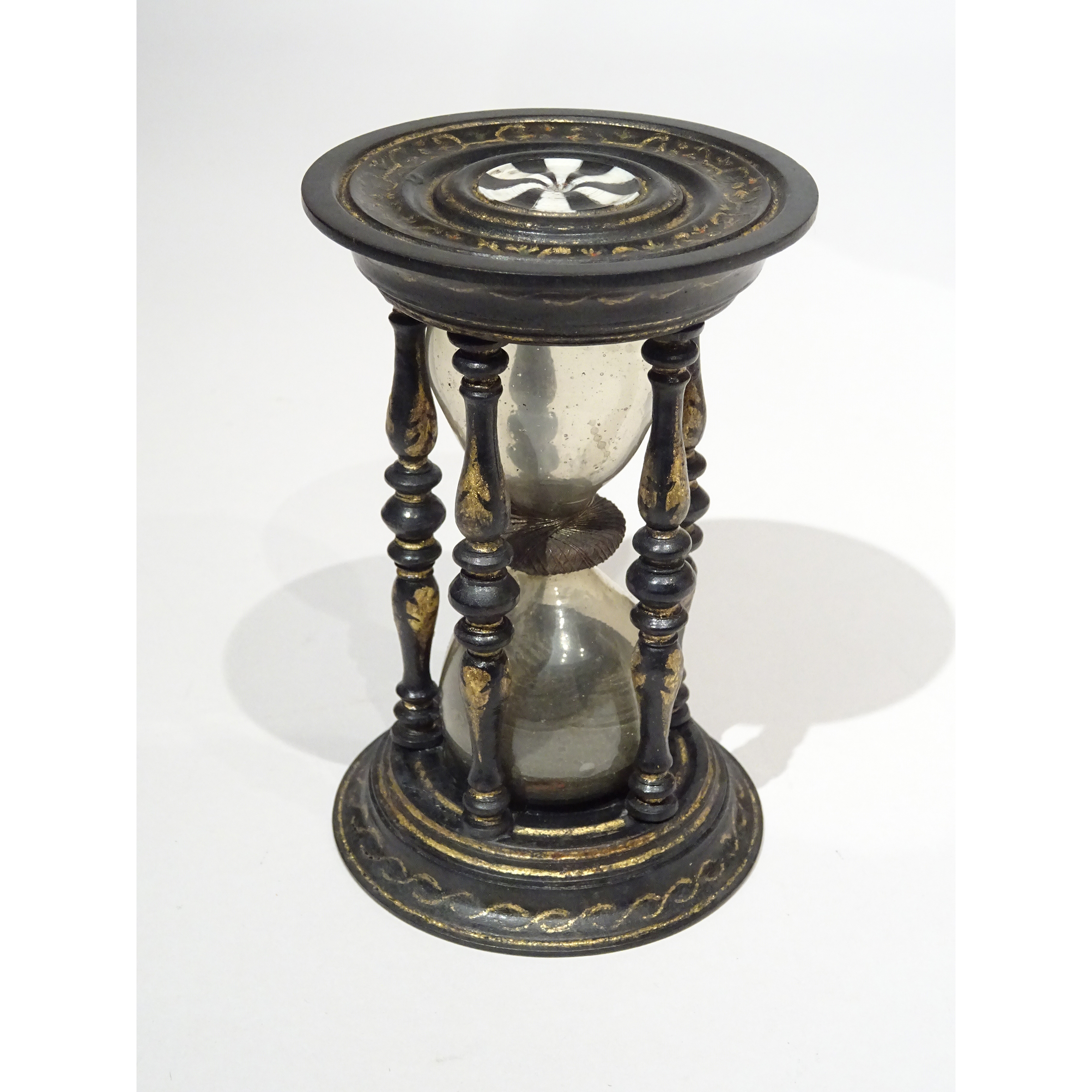 Galerie Delalande – Sablier en bois tourné laqué noir et or, incluant un motif d’ivoire sur chacune des bases qui sont maintenues entre elles par cinq colonnes tournées de forme balustre.