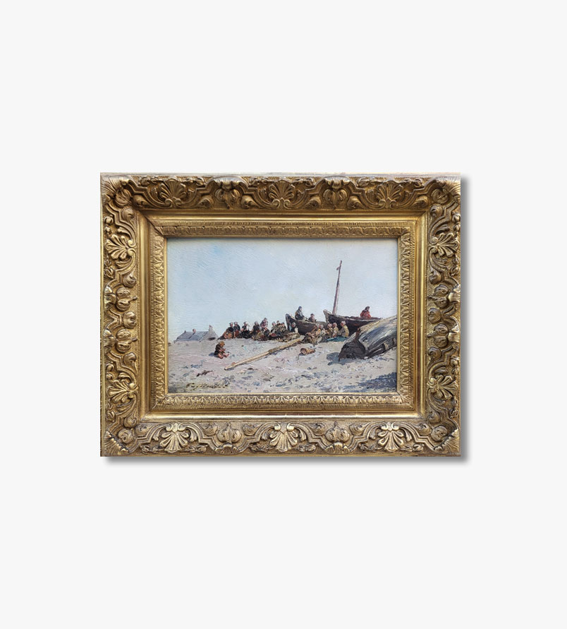 huile-sur-panneau-pecheurs-en-bord-de-mer-par-eugene-flandin